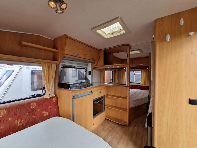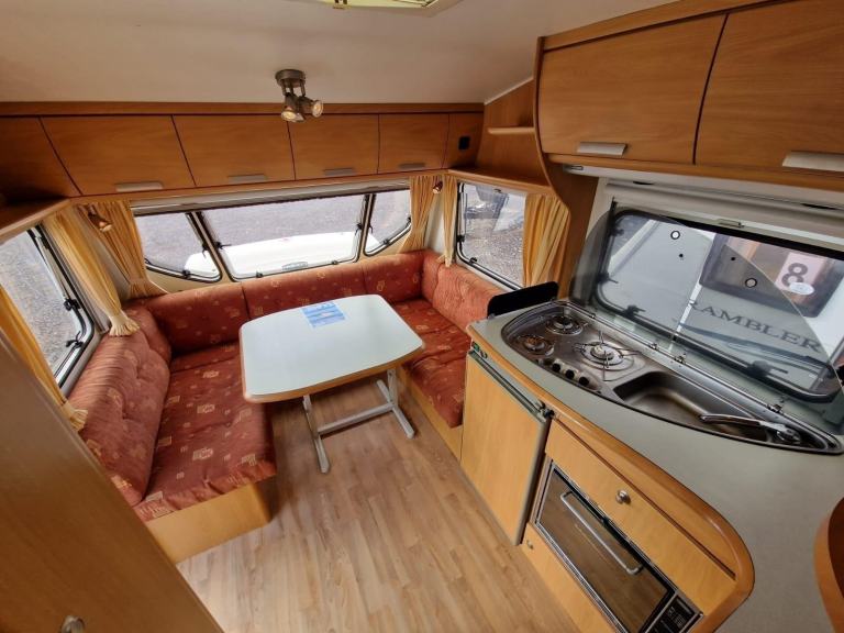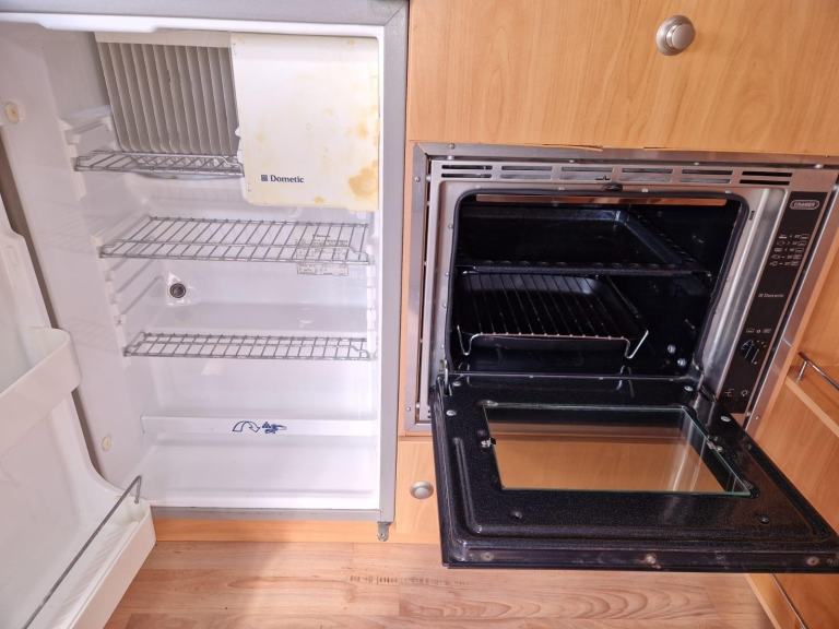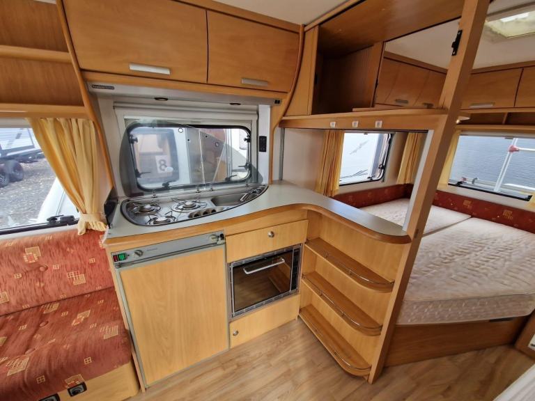• Kitchen: L-shaped kitchen with a three-way fridge (mains, LPG, battery), a gas oven, and a three-burner hob