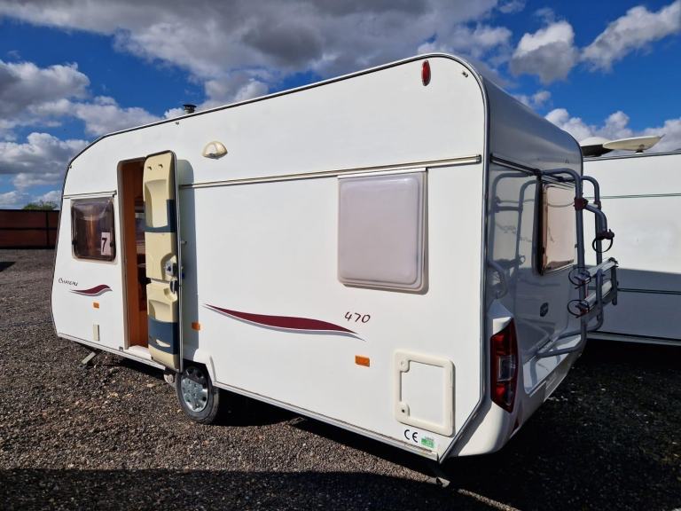 The 2007 Lunar Chateau, with specifications varying by model but generally featuring single axles, double-glazed windows with blinds, a three-way fridge, a gas oven, a 12V lighting system, and a gas and electric hot water system. The 470 model, for instance, has an internal length of 4.40m, a maximum laden weight (MTPLM) of 1250kg, and a 1030kg Mass in Running Order (MRO).