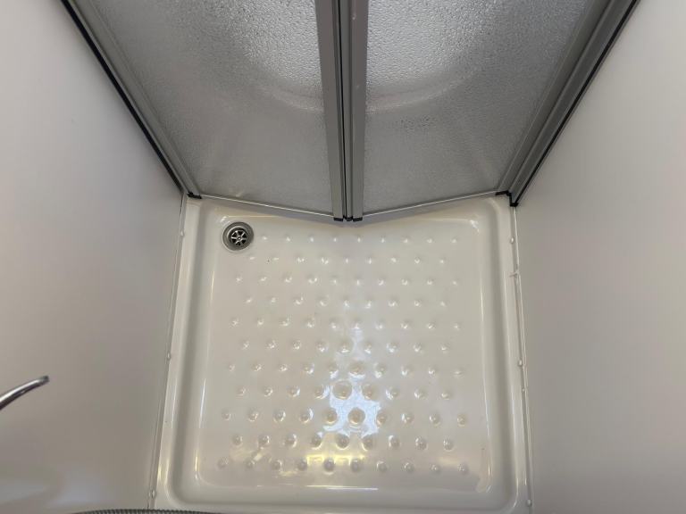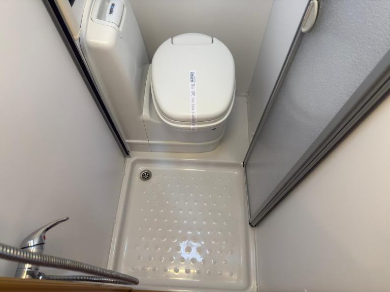 Rear corner washroom with shower area that divides with a shower door from the cassette toilet