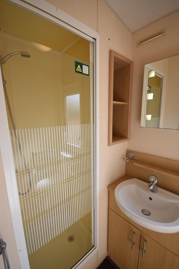 The bedrooms are at each end of the layout, this is great for a bit of privacy and adds hugely to the size of the rooms; the first bedroom at the kitchen end is a double bed with fitted wardrobes and lockers, plus its own en-suite with fully enclosed shower, vanity sink and toilet.