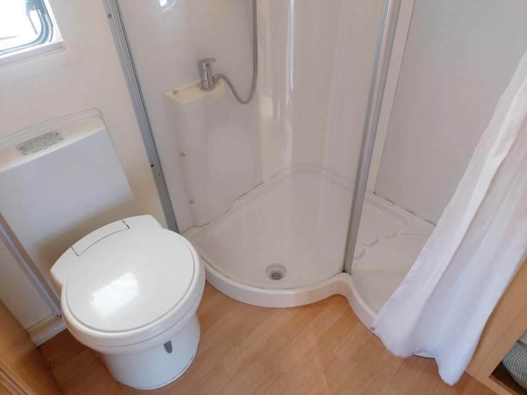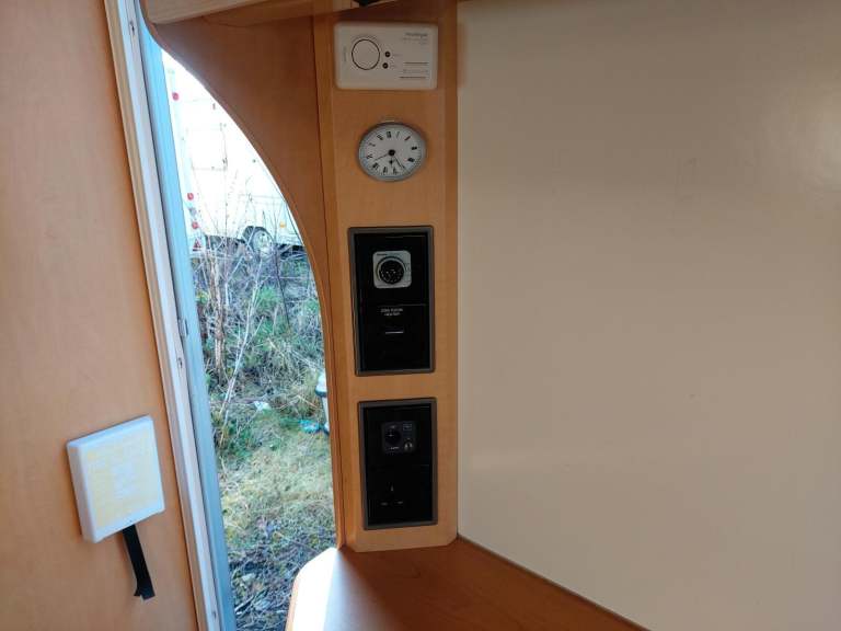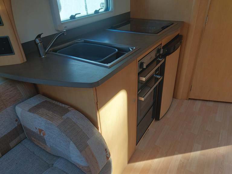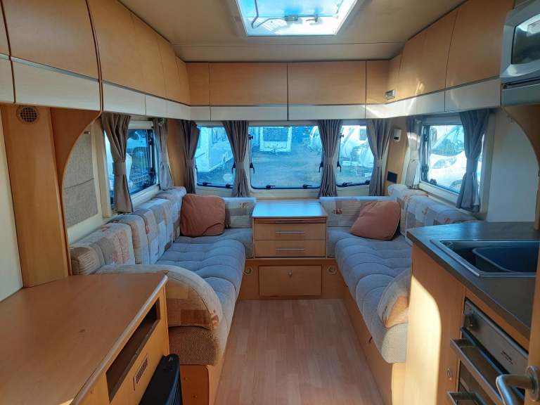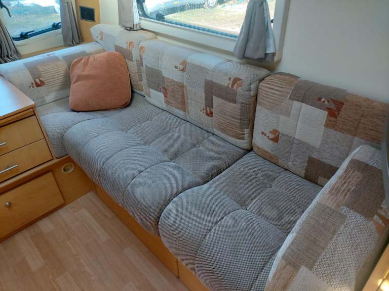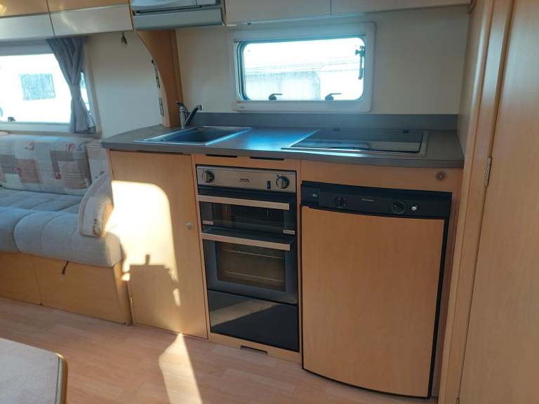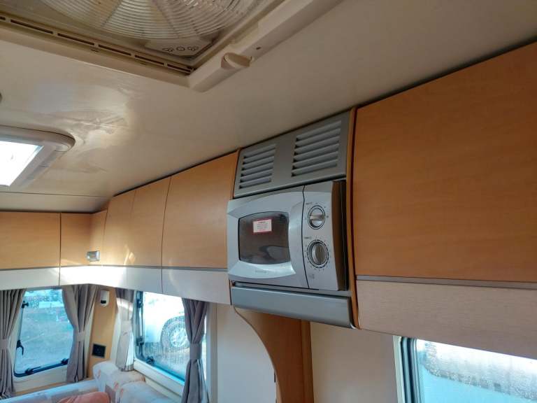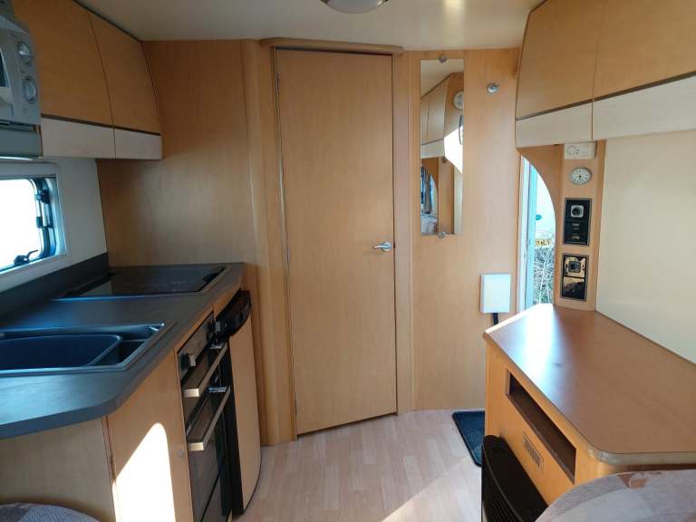 It also has a 3 way fridge freezer, full oven hob and grill, blinds and nets on all the windows , retractable net on the door , heki rooflight , Truma Heating system , roof mounted digital directional aerial with booster box , 12v and 240v electrics , microwave oven, luxurious upholstery , removable carpets, lots of storage space , end wash room, separate shower , sink with vanity unit and swivel cassette toilet.