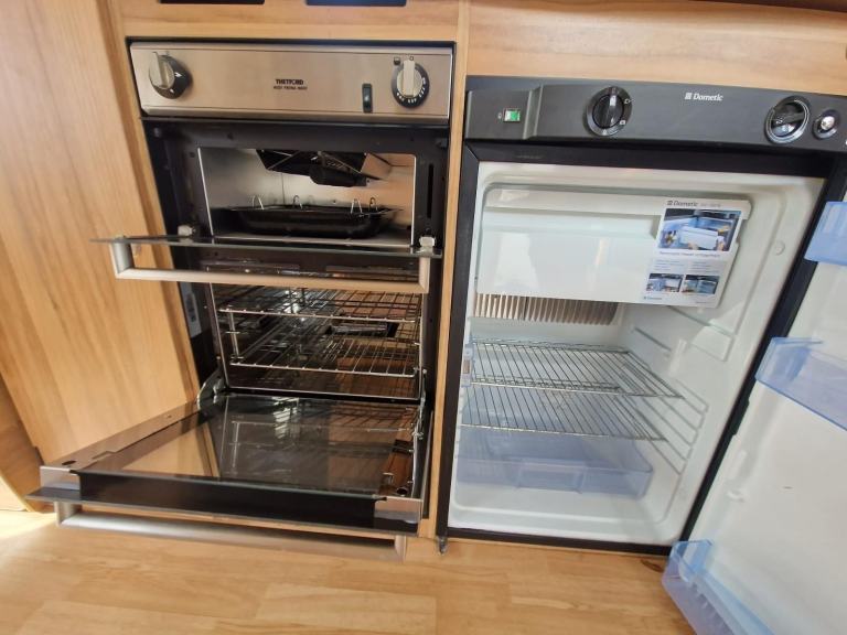 • Kitchen: Thetford K-Series oven, grill, and hob with 3 gas burners and 1 electric hotplate