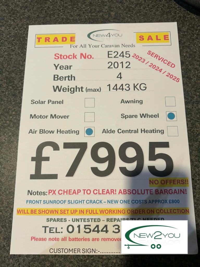 WE WOULD NEVER STATE 'NO DAMP' ON ANY CARAVAN OF ANY AGE - WE ARE VERY HONEST AND ALL OUR CARAVANS ARE PRICED ACCORDINGLY. KNOWN FAULTS ARE HONESTLY DISPLAYED ON FRONT WINDOW STICKERS AND/OR POINTED OUT UPON VIEWING. FRONT SUNROOF HAS SLIGHT CRACK - NEW ONE COSTS APPROX £800