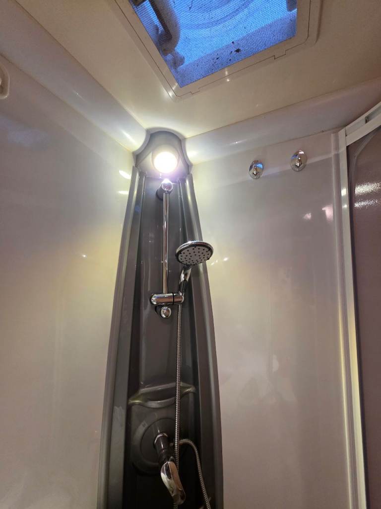 The washroom is located at the rear and includes a separate shower cubicle, toilet, and sink.