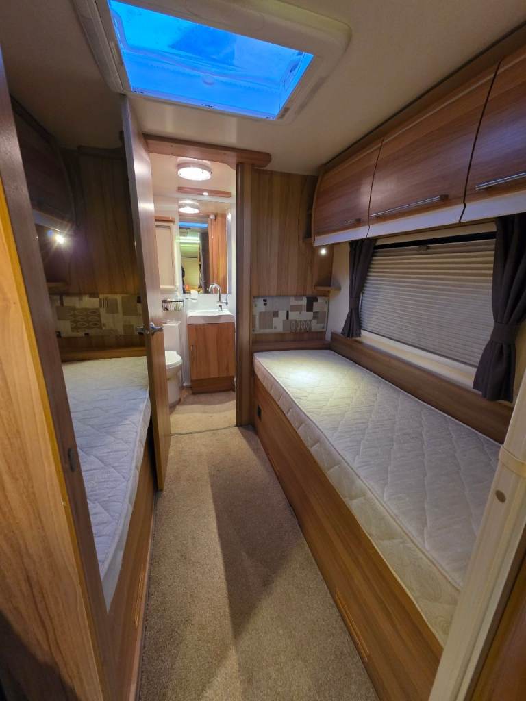 Bailey Unicorn Cadiz II four-berth caravan known for its fixed single beds and end washroom.