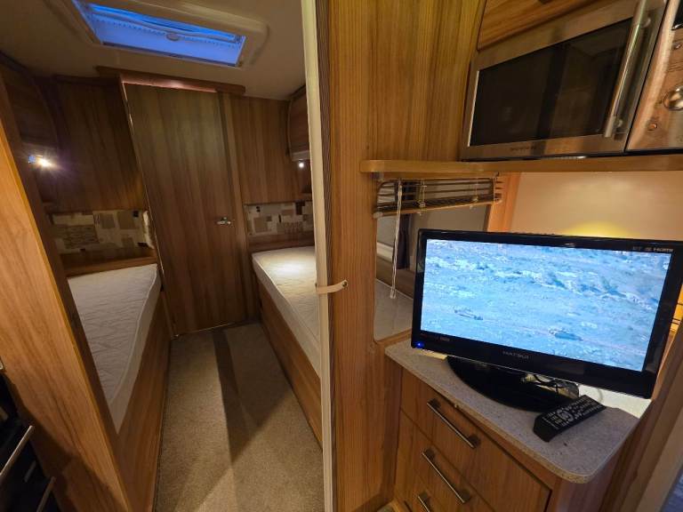 The caravan features two fixed single beds in the rear, ideal for couples or families.