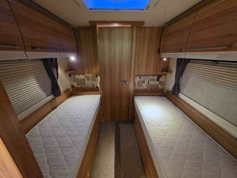 The caravan features two fixed single beds in the rear, ideal for couples or families.