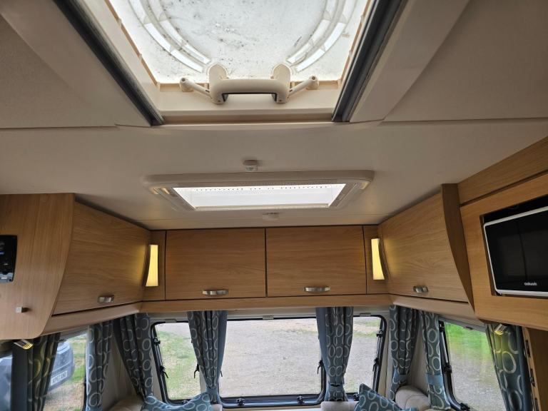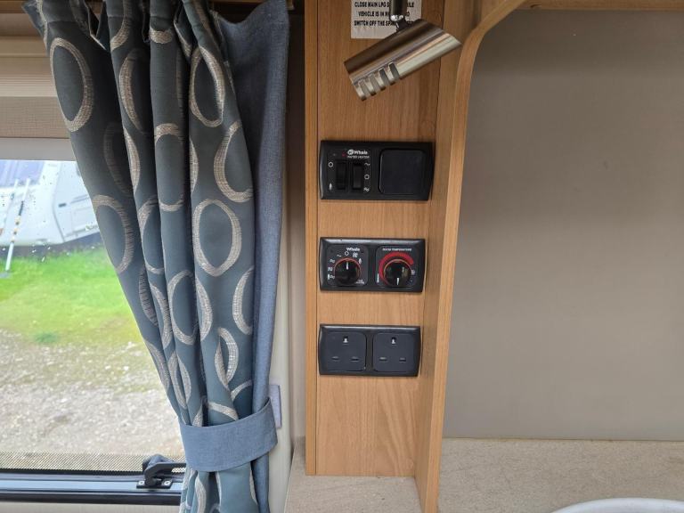 It also has a 3 way fridge freezer, full oven hob and grill, stereo radio, blinds and nets on all the windows, Large heki rooflight, Whale heating system, roof mounted digital aerial with booster box, 12v and 240v electrics, nice upholstery, lots of storage space, end washroom with separate shower, sink with vanity unit and swivel cassette toilet.