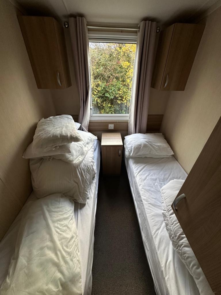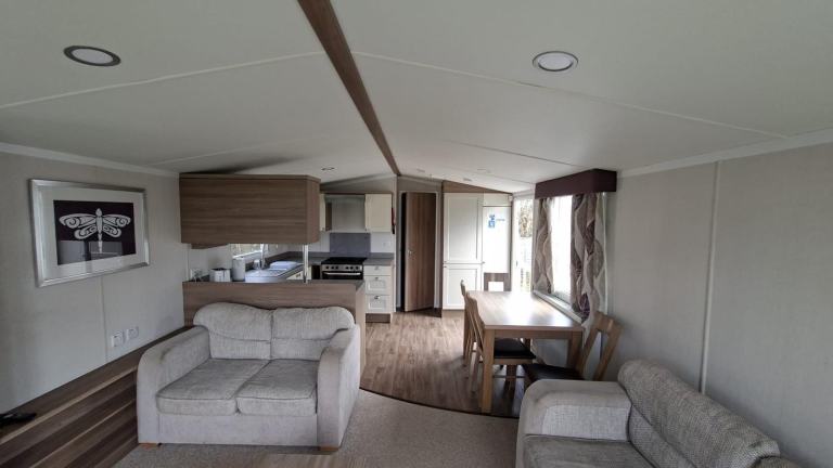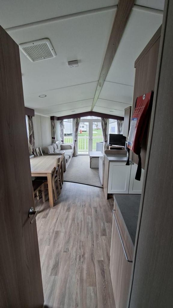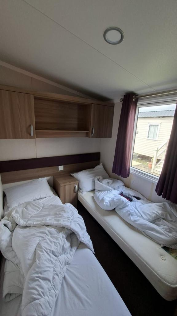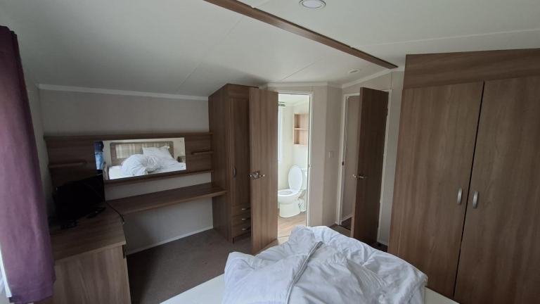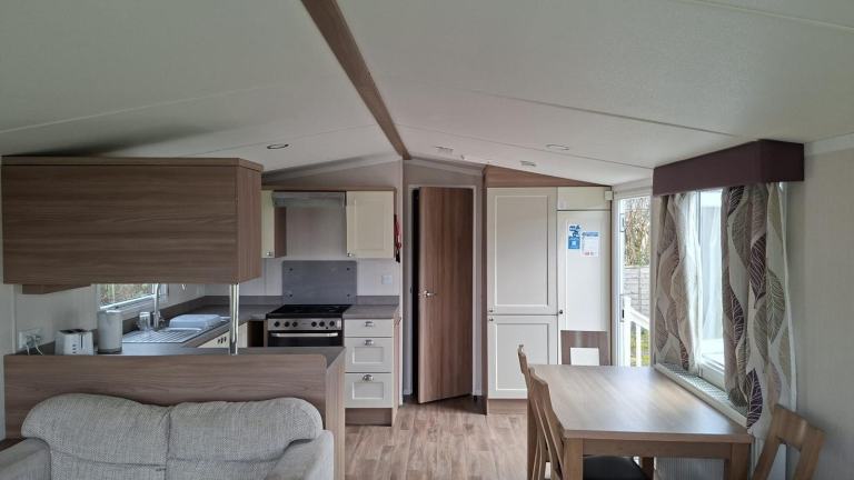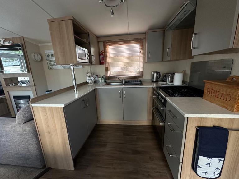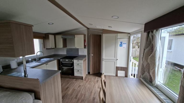 The kitchen is sensibly arranged for everyday living and comes fitted with an oven, hob, extractor fan, and microwave. Storage is strong throughout the caravan, especially in the bedrooms, making it practical for longer stays.