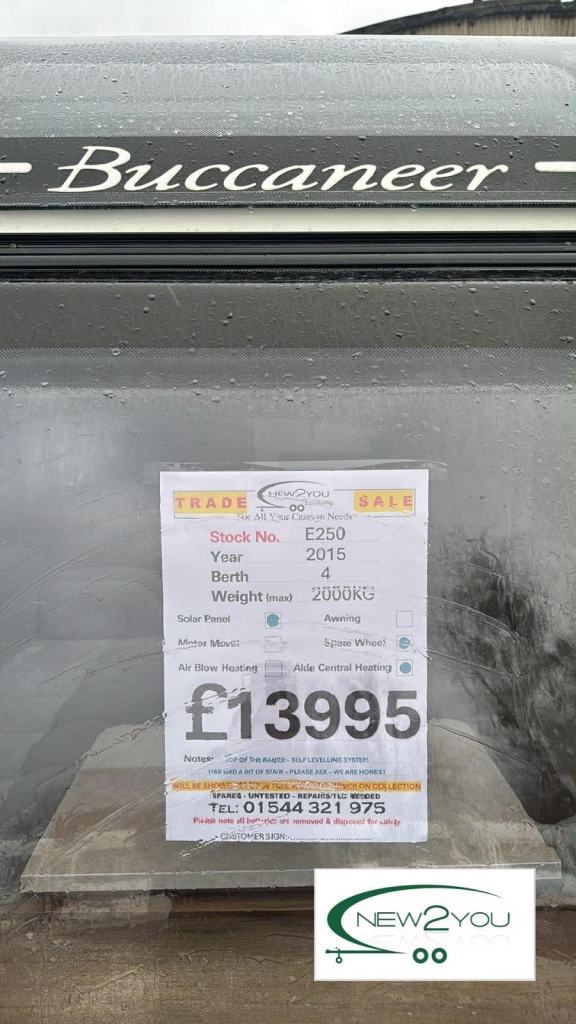 ALL OF OUR RETAIL CARAVANS ARE SET UP IN FULL WORKING ORDER AND EVERYTHING IS SHOWN BEFORE BEING COLLECTED OR DELIVERED. WE ALWAYS RECOMMEND CUSTOMERS TO COME AND VIEW THE ITEM TO SEE IF IT IS FIT FOR THE PURPOSE IN WHICH NEEDED. WE ARE OPEN 7DAYS A WEEK TO DO SO . THERE ARE SOME USUAL MARKS ALL TO BE EXPECTED WITH ANY CARAVAN. THIS IS NOT NEW, AND NOT DESCRIBED AS NEW. INDEPENDENT INSPECTIONS WELCOME THROUGH MEMBERS OF THE 'MCEA' MOBILE CARAVAN ENGINEERS ASSOCIATION - EASILY FOUND ONLINE, THEY WILL CARRY OUT A COMPLETELY INDEPENDENT PRE PURCHASE INSPECTION FOR YOU.