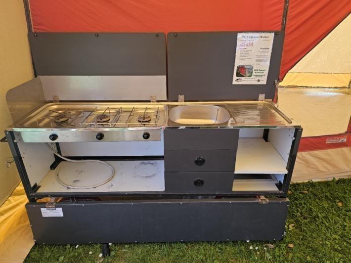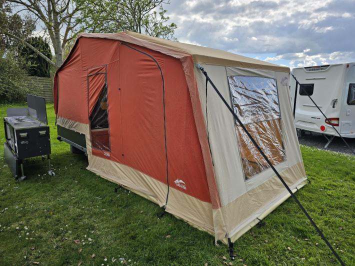 This luxurious 2 berth Cabanon trailer tent is available from our Highbridge branch. This Malawi has the deluxe kitchen unit and both the main 2.5m awning and additional sun canopy with zip in mesh panel. Please note that there are signs of wear on the canvas’ plus a small tear on the awning front panel.