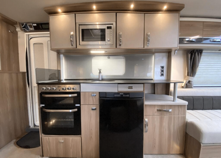 A well equipped kitchen is located in the centre of the caravan and benefits from plenty of worktop and storage space and a great deal extras including a microwave, hob, oven and grill.