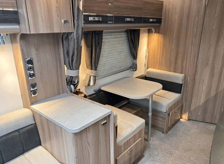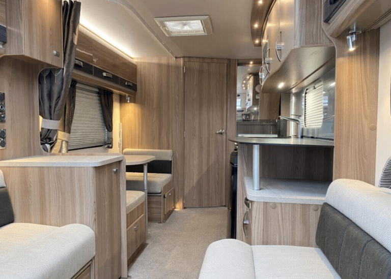 Superb caravan with the side dining area and end washroom layout.