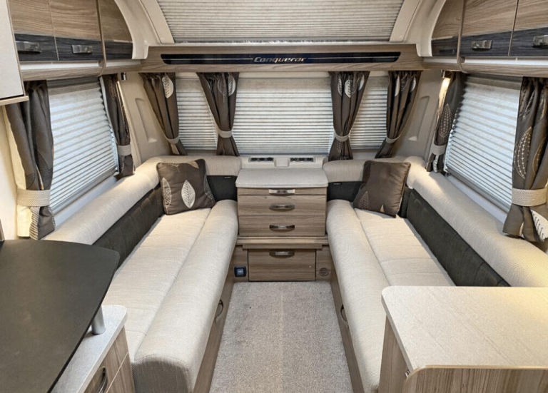 There is a spacious front with parallel bench seats that can be used as either two single beds or one large double bed to sleep two.
