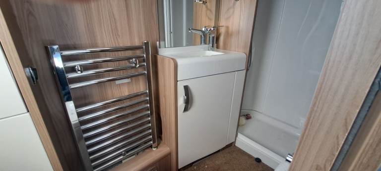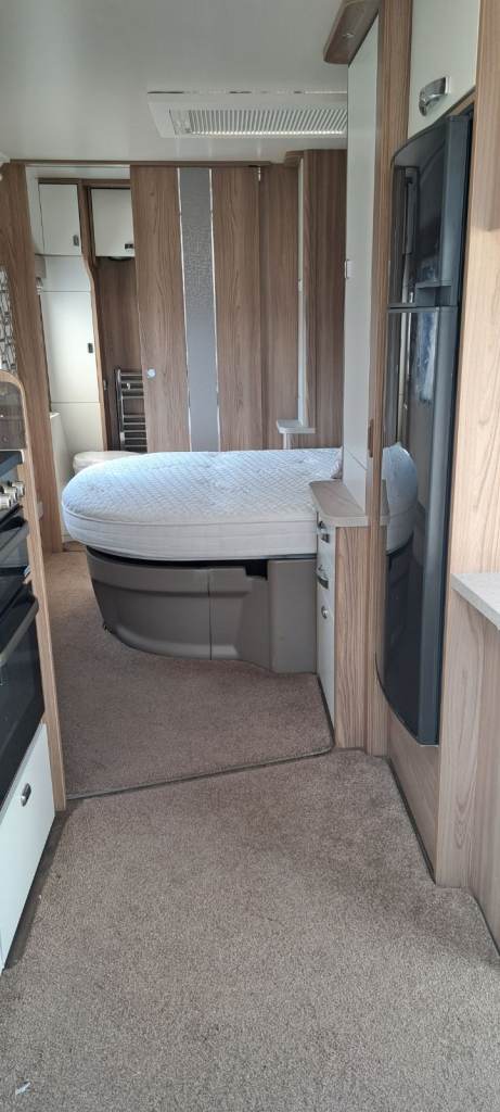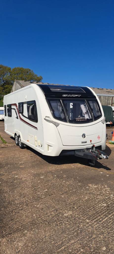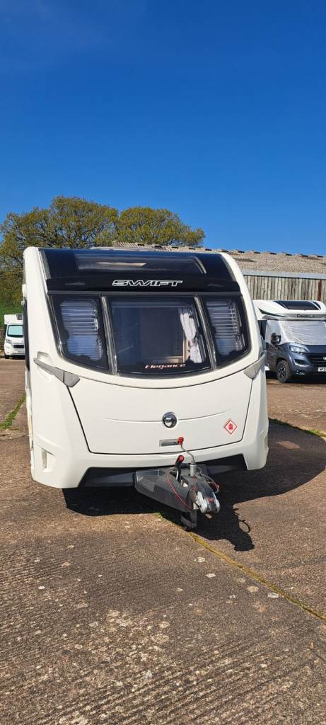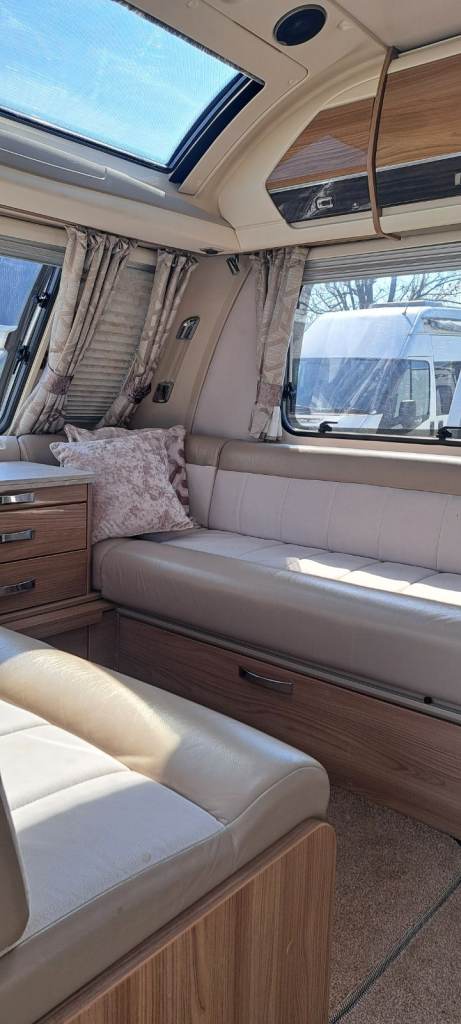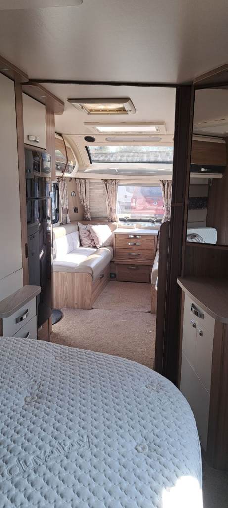 Highly sought after twin axle, 4-berth touring caravan with a transverse island bed, a rear washroom with a separate shower, and a spacious front lounge that converts into a double bed.