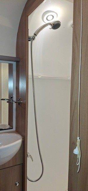 The end washroom provides a large, private space to freshen up with toilet, washbasin and shower.
