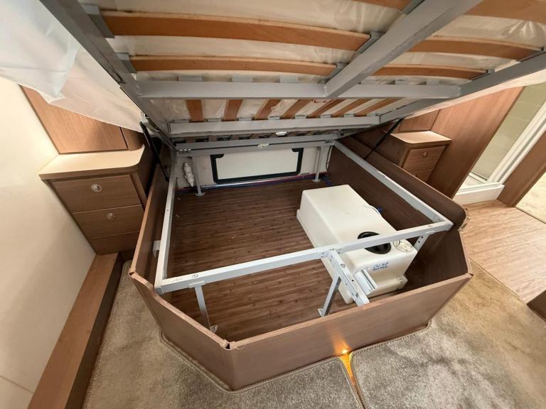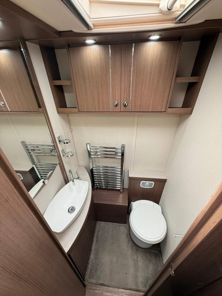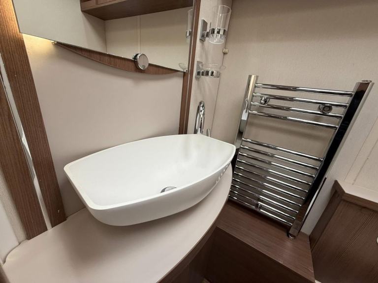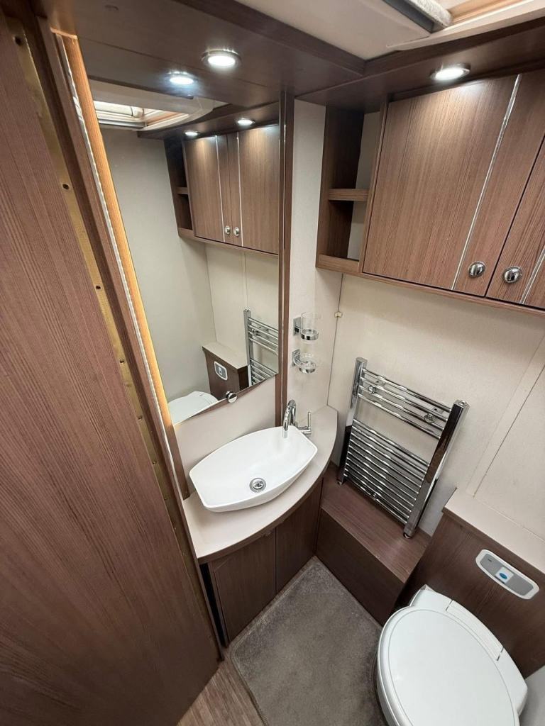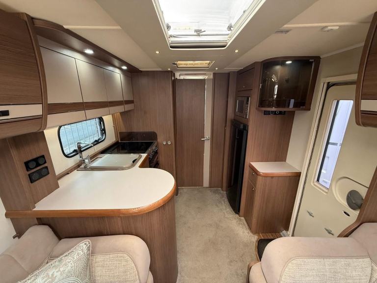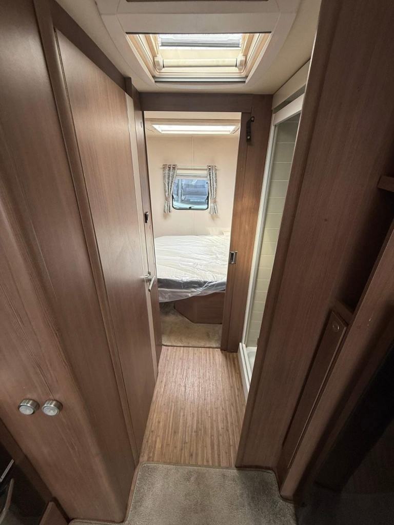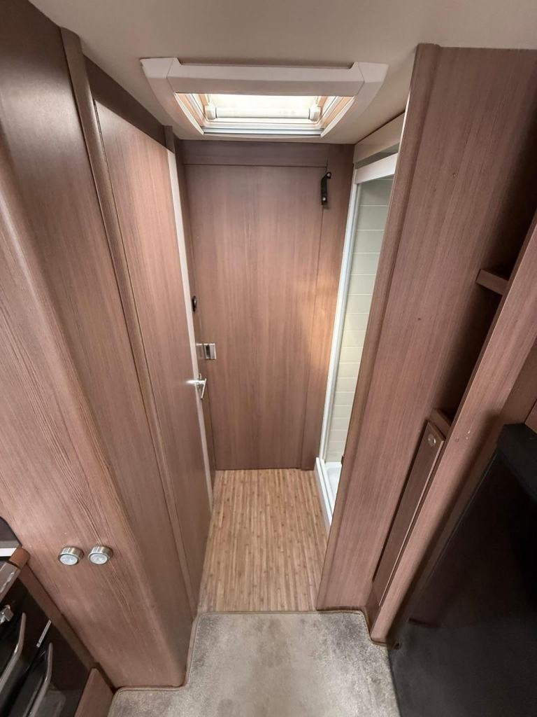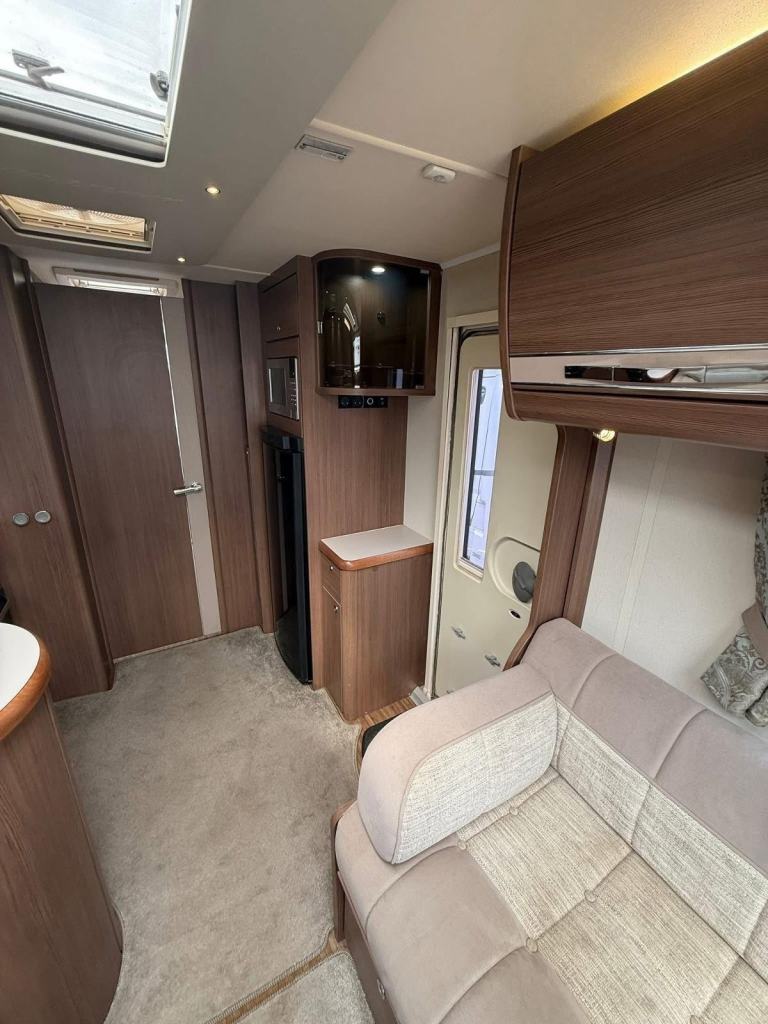 The Buccaneer Commodore is a twin-axle model with retractable transverse fixed island bed at the rear and superbly spacious lounge up-front, separated by luxurious washroom and shower room amidships. This central area can be closed off from both the bedroom and from the living area, creating a true en-suite layout. A flexible option for couples and families alike.