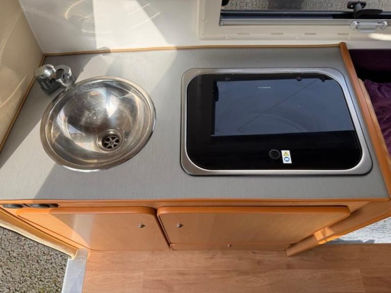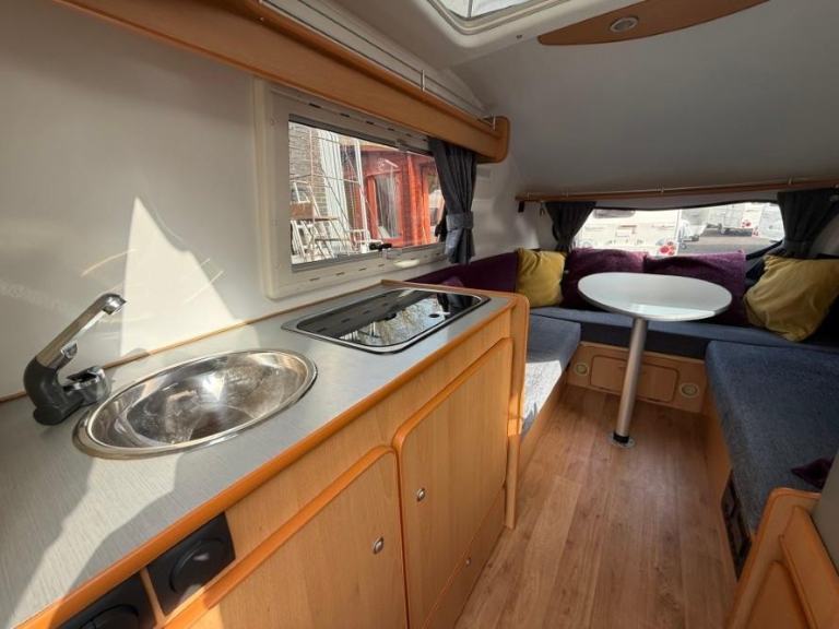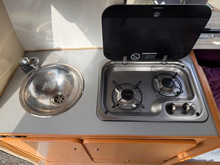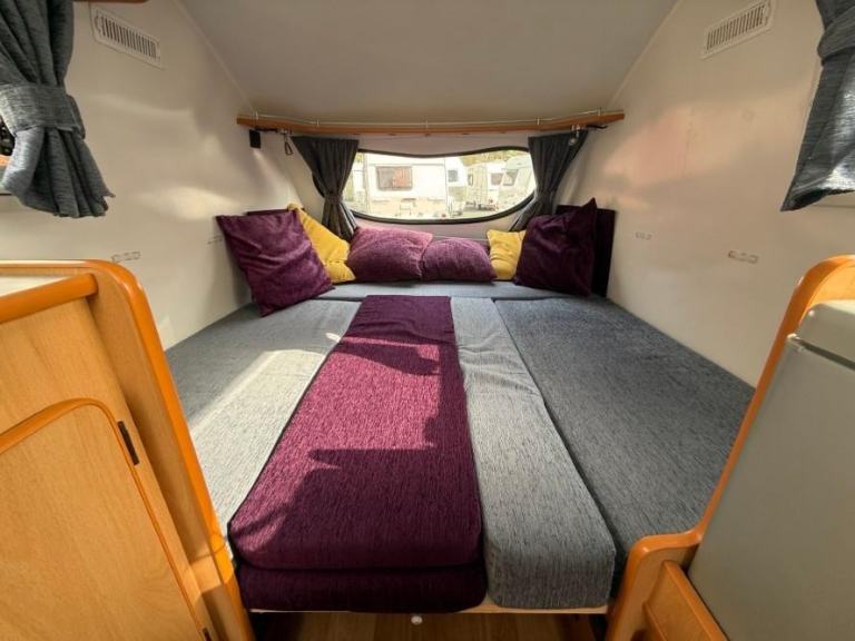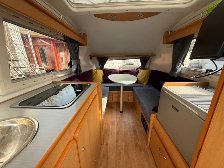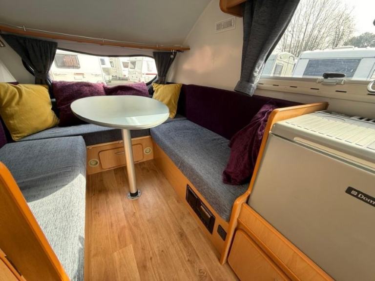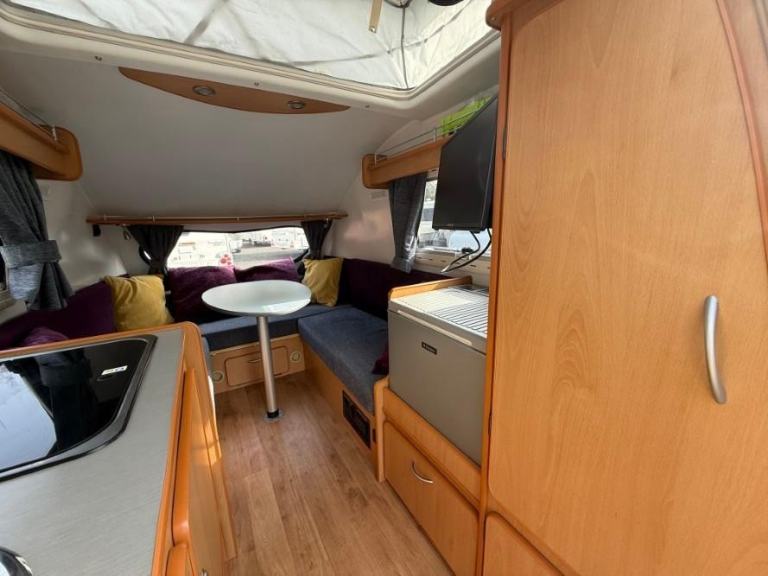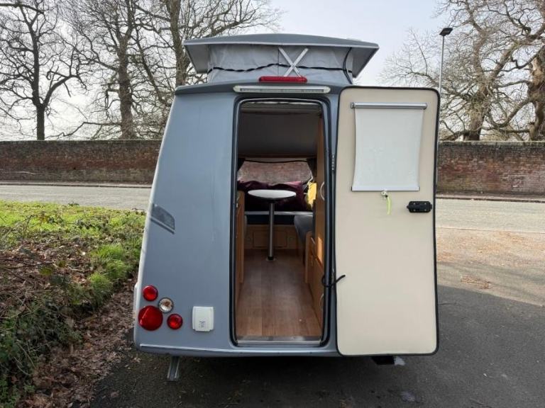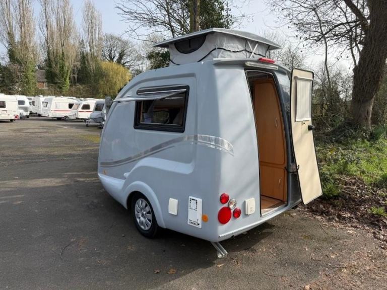 The Go Pod is a micro touring caravan with a 2 berth layout and kitchen area with 2 burner hob, sink and 230V/Gas fridge. The tiny size makes it easy to store and tow, whilst the pop-top roof section allows generous headroom of 1.83m