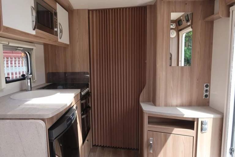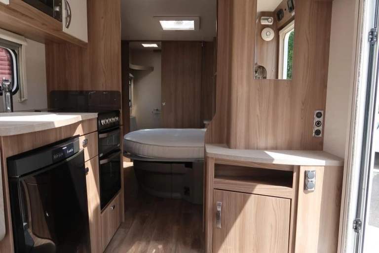 Stylish and modern 4-berth touring caravan with fixed island bed & full rear washroom – lightweight, comfortable, and ready to tour! Fixed island bed with full end washroom