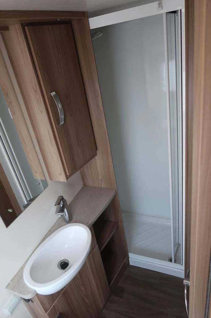 Large rear washroom with separate shower cubicle, Thetford toilet, and vanity basin