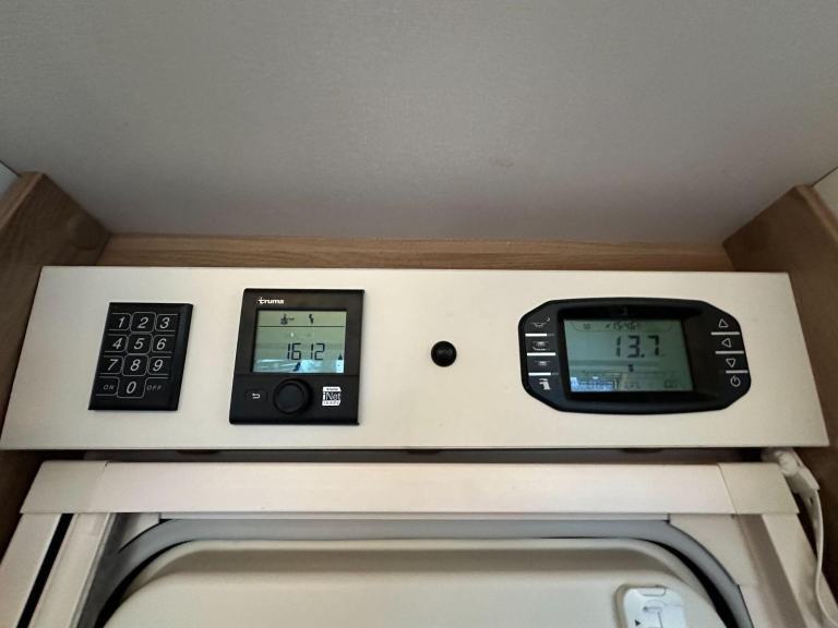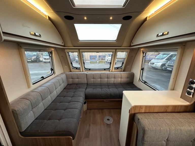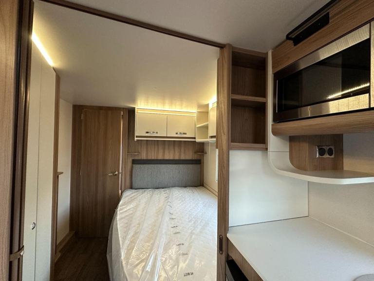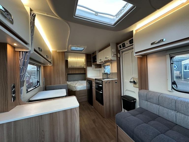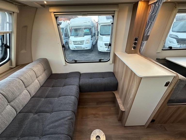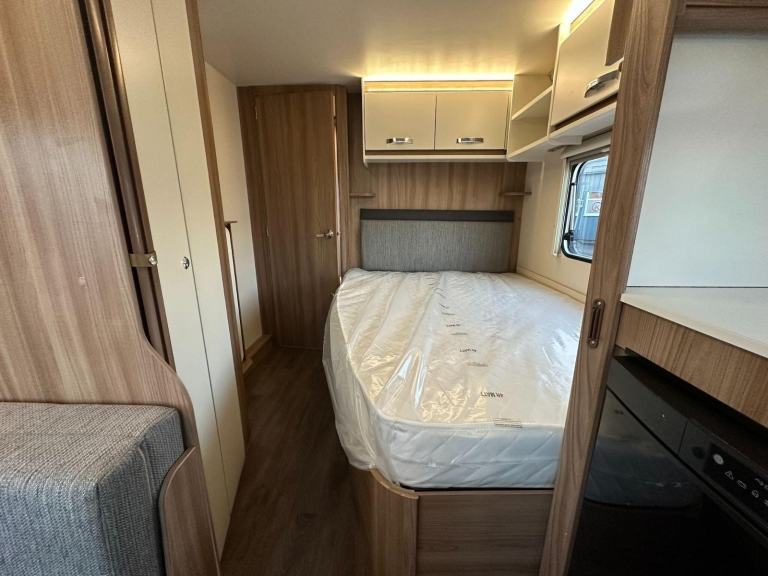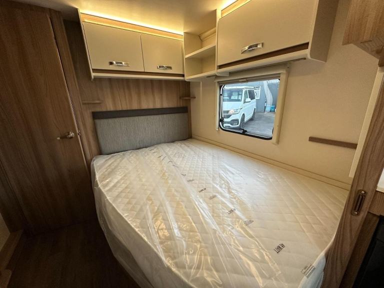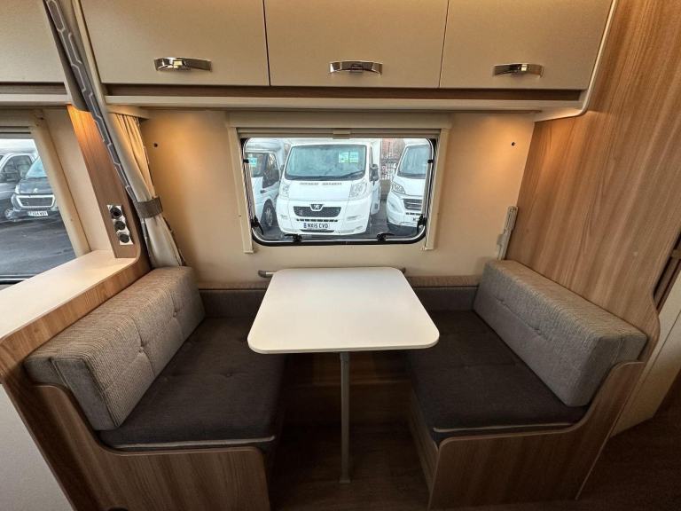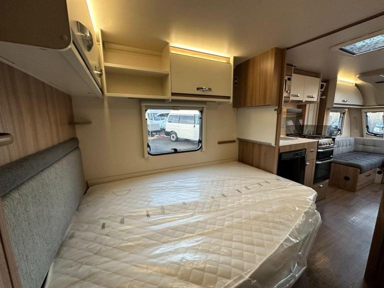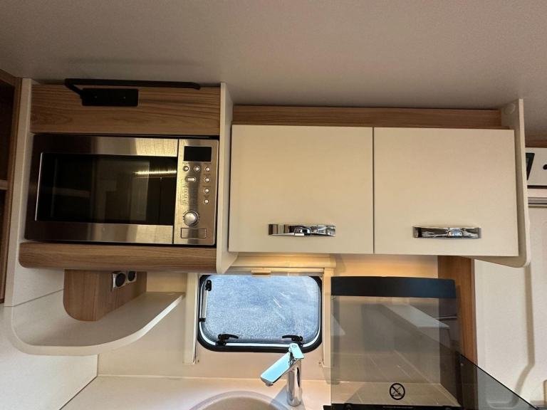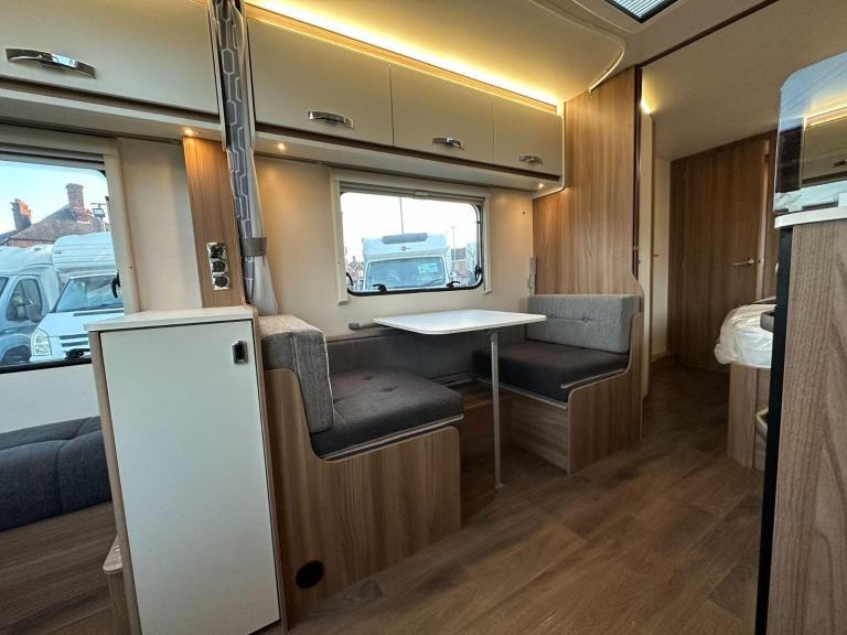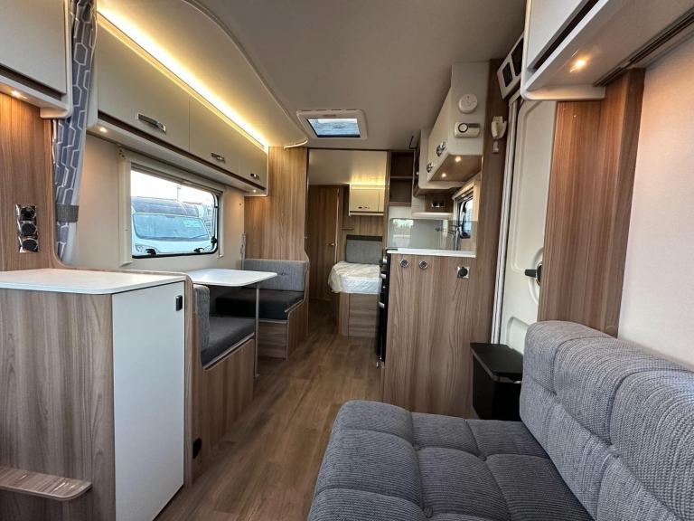 Fixed French Bed, Pull-out Bed - Lounge conversion, Pull-out Bunk Bed | Bathroom with separate shower and Thetford toilet | Truma Heating | Thetford oven, Dometic Fridge / Freezer | Solar Panel| Motor Mover | Spare Wheel | 12V TV Aerial | Kenwood Speakers.