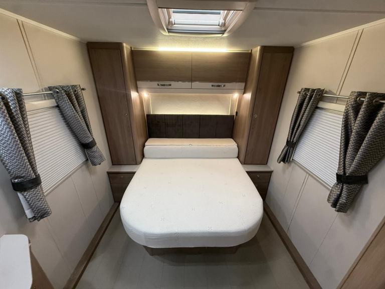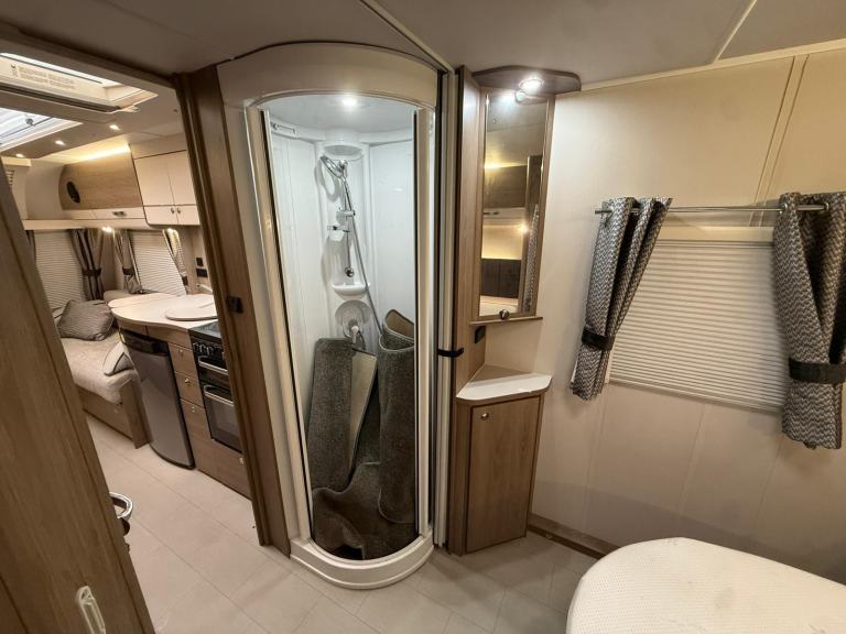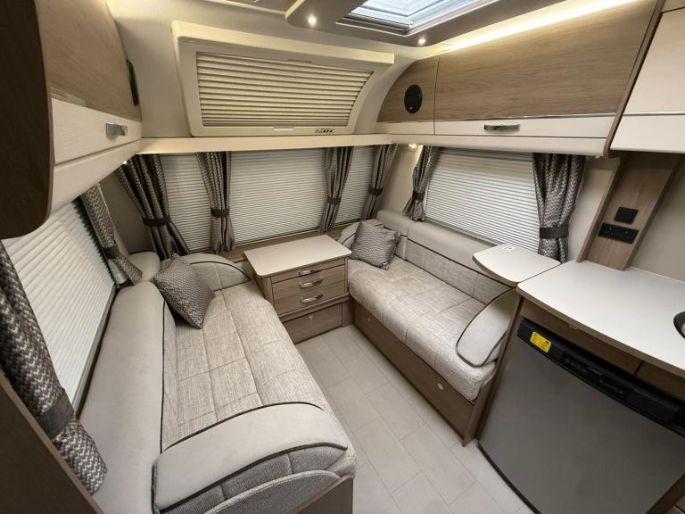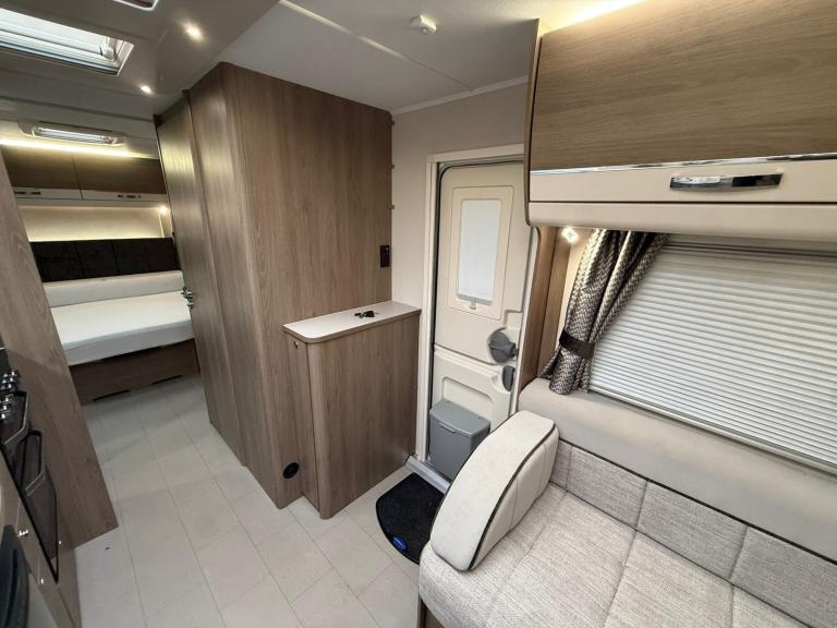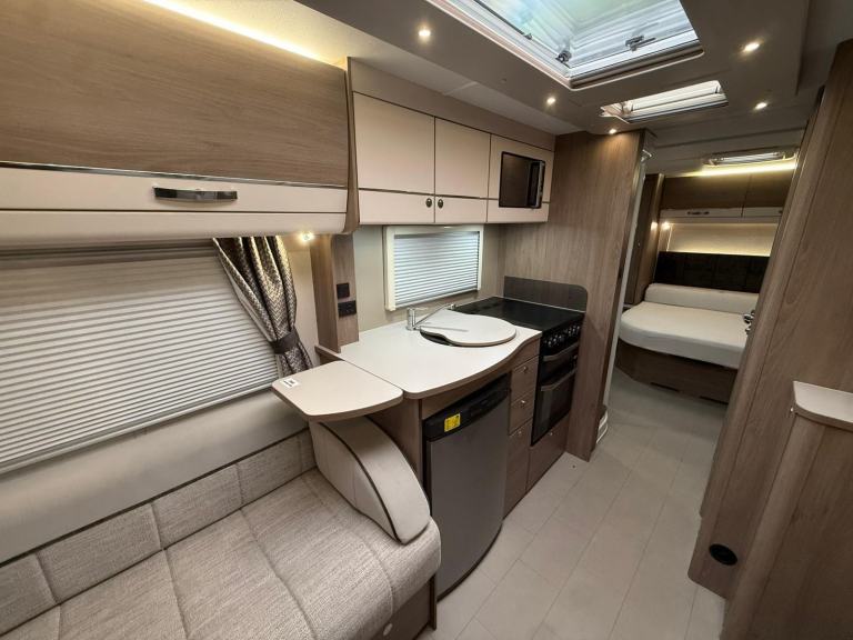 TV; Sunroof; Central Heating; Fixed Double Bed; Alarm; Microwave; Cooker; External Side Lockers; 12V Lighting; Blinds; Grill; Mains Hookup; Separate Shower; Sink; 240V Lighting; Oven; AM/FM Stereo; Hand Washbasin; Round Seating Group