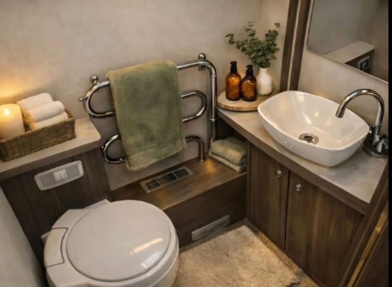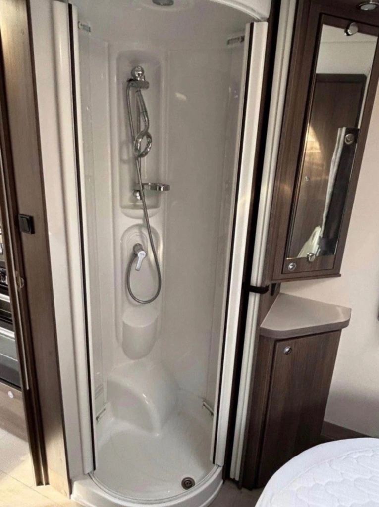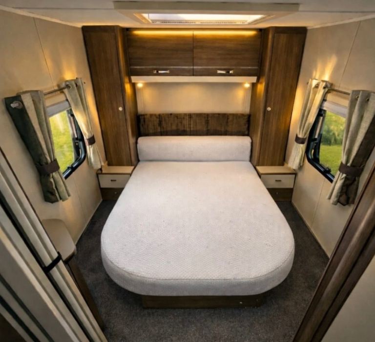 Bedroom: Retractable fixed island bed with en-suite configuration. Separate WC & Shower.