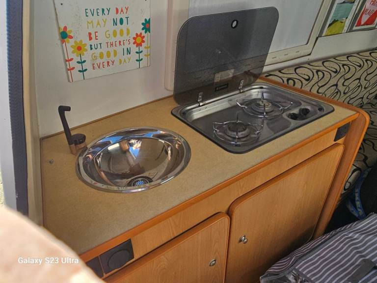 The kitchen area is neatly designed and well equipped with hob, sink, fridge and useful worktop space, along with storage cupboards for essentials. Everything is positioned efficiently to make the most of the compact layout.