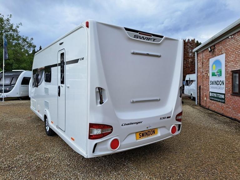 This used 2019 Swift Challenger is on display at our Swindon branch. This 4 berth caravan has an End washroom and a Lounge conversion. This caravan comes with a 12-month warranty. Full 100-point pre-delivery inspection, solar panel for keeping your leisure battery topped up, an alarm system to reduce insurance premiums and to give you peace of mind, an external BBQ point so no need to connect a separate gas bottle, an external 240v plug socket for power in the awning. This caravan is also being supplied with a full starter kit worth over £500. This will include a Gas bottle, Gas pigtail, Leisure Battery, 25 Metre mains cable, Aquaroll, Wastemaster, Hitch Lock and Step. If you have all of these items we will supply £500 vouchers to spend in our shop instead. If you would like to hold this Swift Challenger caravan for 72 hours we can take a refundable deposit of £500 subject to you viewing the caravan. If you require any further information on this caravan either call one of our sales team., Alarm, Microwave, Solar Panel, External 240v, Gas Bbq Point, 12v Power, Alloy Wheels, Awning Light, Battery Charger, Blinds, Cassette Toilet, Double Glazing, Flyscreens, Free Standing Table, Fridge, Fridge Freezer, Galvanised Chassis, Heater, Heki Rooflight, Hitch Stabiliser, Hob, Hot And Cold Shower Unit, Insulated Panels, Loose Fit Carpets, Mains Electric, Mixer Taps, Oven, Pull Out Bed, Shower, Shower Unit, Skylight, Smoke Detectors, Spare Wheel, Tv Aerial, Central Heating, Alde Wet