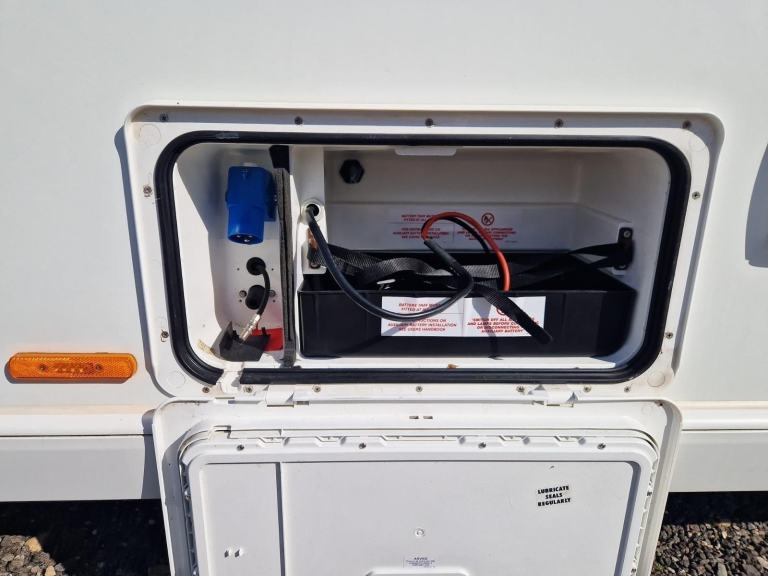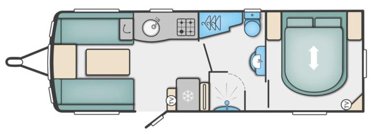 • Washroom: A central washroom is positioned mid-caravan, separating the living and sleeping areas.