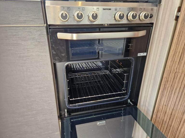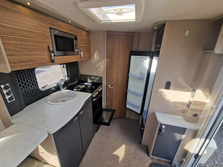• Kitchen: A central kitchen area is equipped with a tall, slim-line Dometic fridge/freezer, a dual-fuel hob, an oven, and a microwave.
