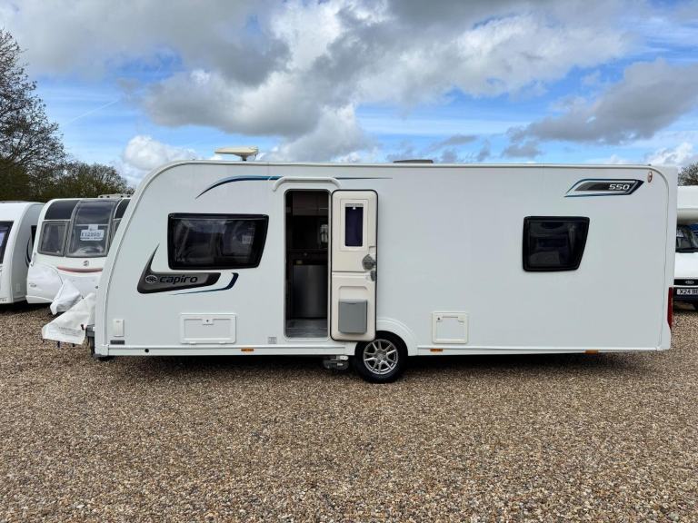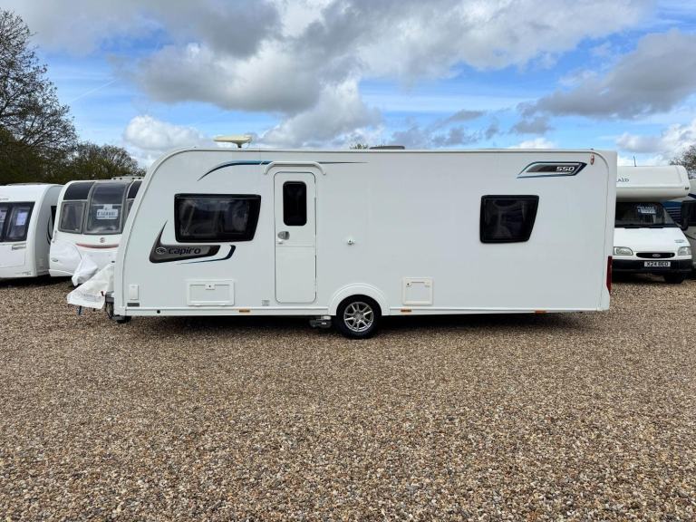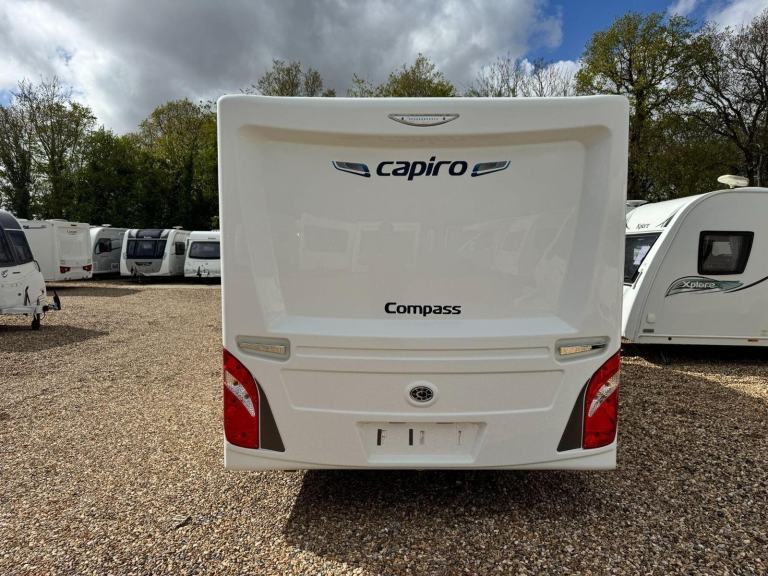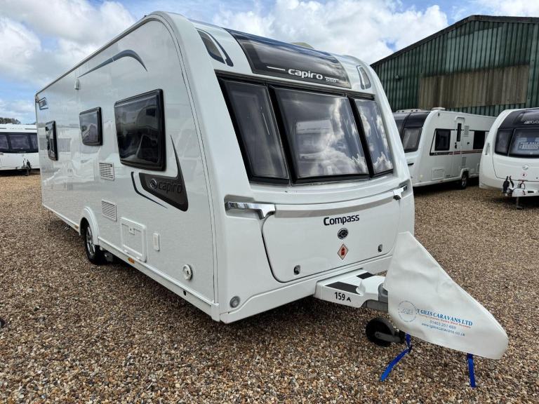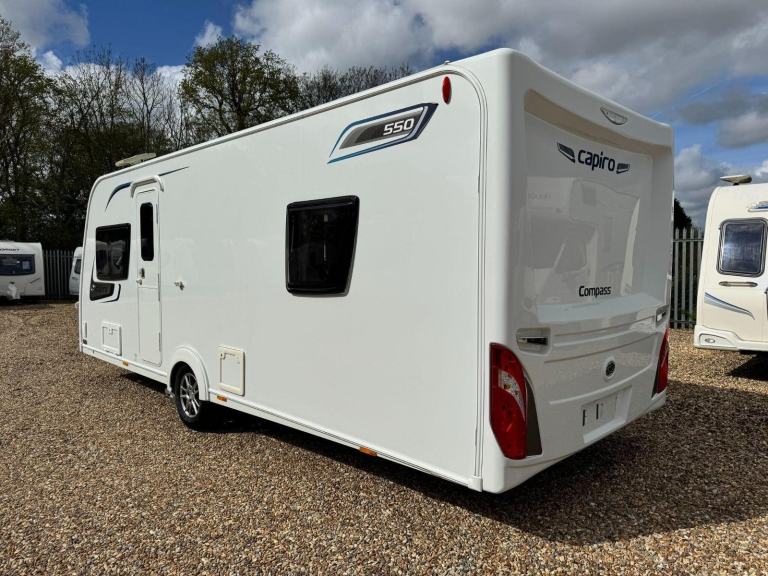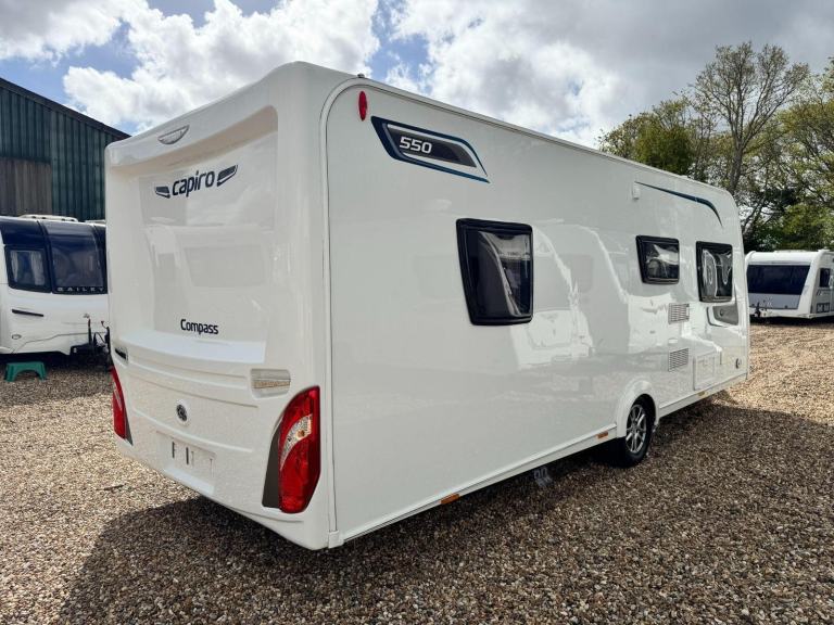 The Compass Capiro 550 is a well designed single-axle caravan, offering a perfect blend of comfort, practicality, and lightweight touring. With its sought-after island bed layout and high-end specification, this model is ideal for couples looking to travel in comfort and style.Inside, you?ll find a spacious front lounge that easily converts into a large double bed or can be used as twin singles. The centre kitchen is well-equipped with everything you need for extended trips, while the standout feature is the retractable island bed ? giving you extra space during the day and a comfortable sleeping area at night. To the rear, the caravan boasts a generous washroom with separate shower, creating a true en-suite feel.The Capiro range is known for its premium build quality and impressive spec, including Alde central heating for year-round comfort and a fully bonded SoLiD construction for durability and insulationKey Features Include:ALDE wet central heating systemIsland bed with retractable functionSpacious end washroom with separate showerFully equipped kitchen with oven, grill & hobPanoramic front sunroof & large rooflightAlloy wheels & stabiliser hitchLED lighting throughoutExternal BBQ point & 230V socketSupplied with 6-month warranty., 12v Power, Alloy Wheels, Alloys, Battery Charger, Blinds, Central Heating, Cocktail Cabinet, Domestic 4 Burner Hob, Domestic Twin Cavity Oven, End Bathroom, Ensuite, Exterior Access / Storage Locker, External 240v, Exterior Gas Bottle Locker, Exterior Lantern Lights, External Battery Locker, External Lighting and Safety, Fixed Bed, Fridge, Galvanised Chassis, Microwave, Mains Electric, Mixer Taps, Motor Mover, Oven, Shower, Skylight, Stereo System, TV Aerial, large selection of used caravans in stock,we have been supplying caravans for over 30years