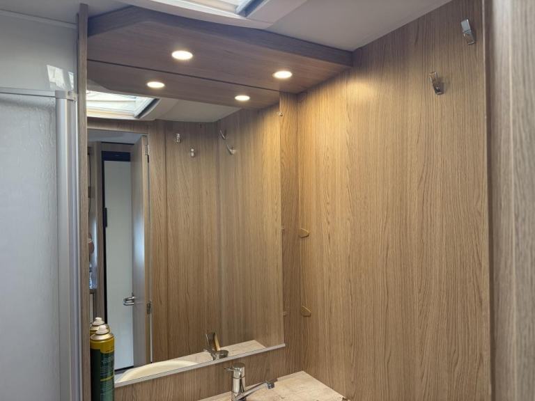Well equipped with central heating, hot and cold water, leather upholstery seating, gas hob, full oven with grill, and a large fridge freezer. Plenty of storage throughout with a modern, high-end interior finish.