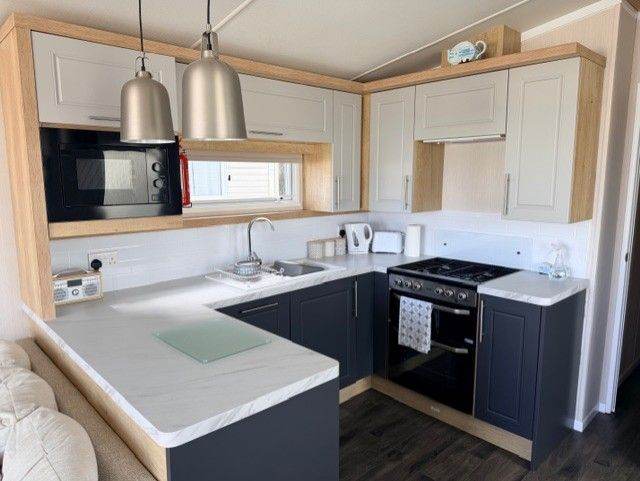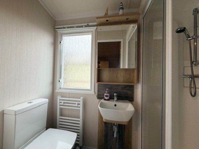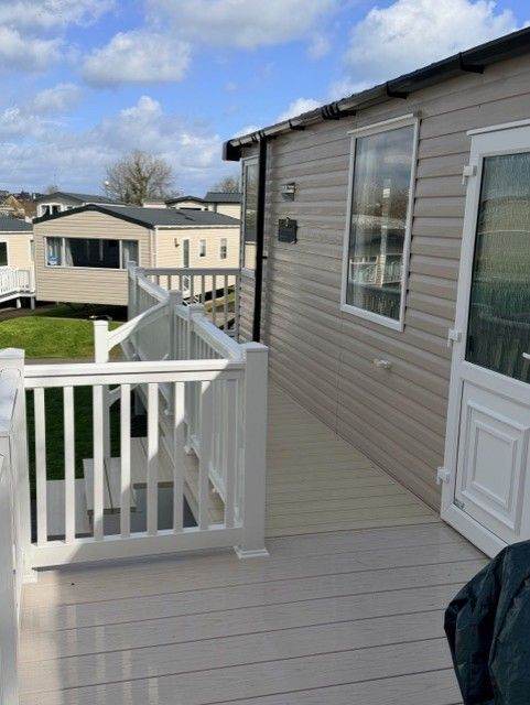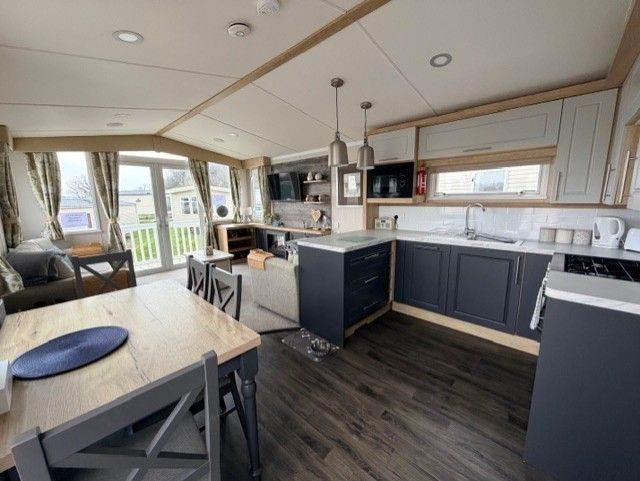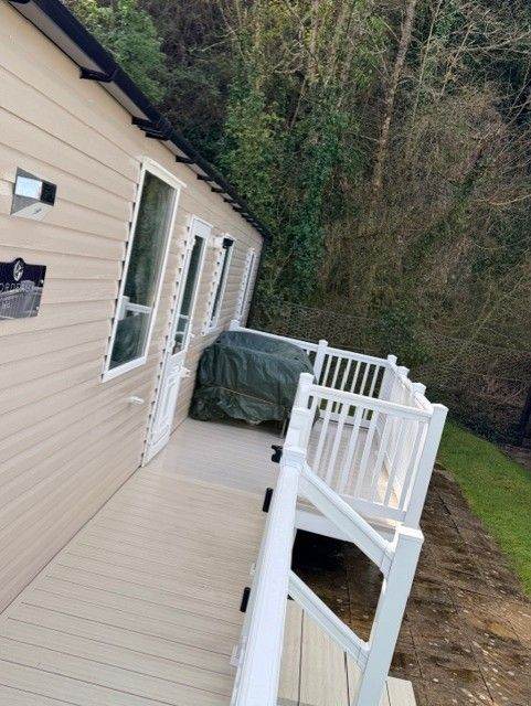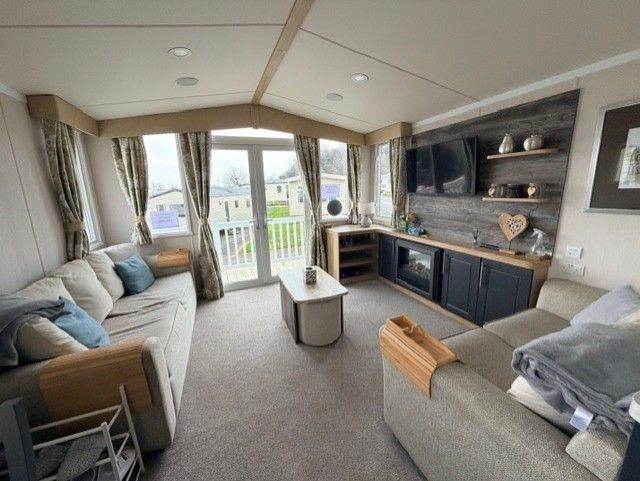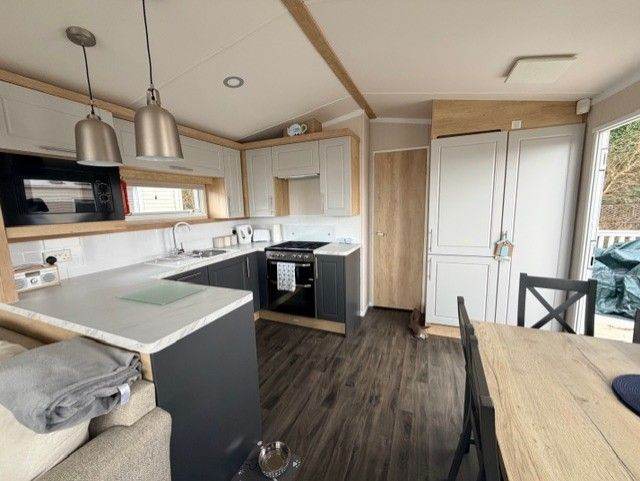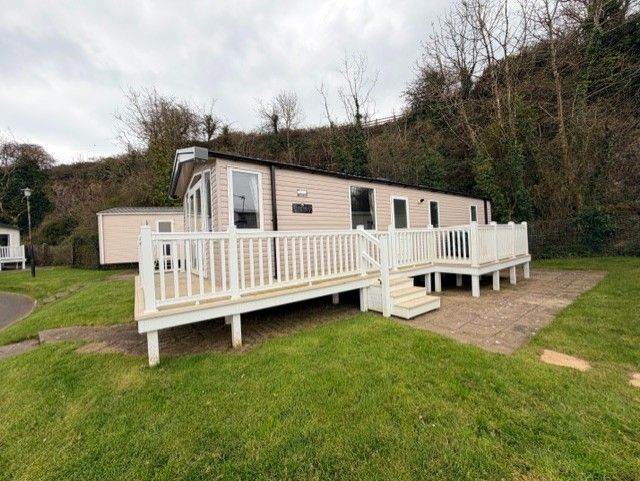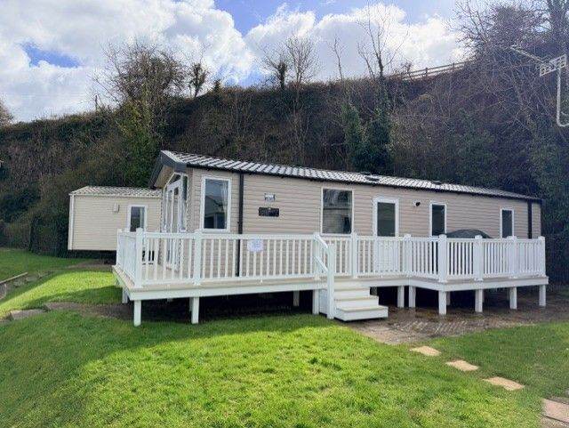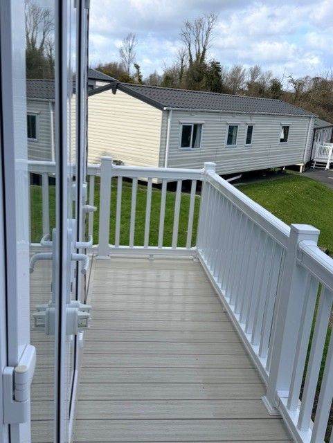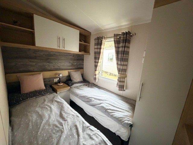 Immaculate caravan for sale based at Kiln Park in the stunning town of Tenby, Wales. The caravan has 2 bedrooms and can sleep up to 6 people. The living area has freestanding furniture with a sofabed. The dining table seats 4 people. The kitchen features a dishwasher, built-in microwave and an integrated fridge freezer. The main bedroom is spacious and has its own shower-room ensuite. It has plenty of wardrobe space and an ottoman bed. The second bedroom has 2 single beds and wardrobe space. There is a main shower room as well as the ensuite. The caravan has outdoor decking surrounding the front and side. Patio doors open onto the front, while to the side there is enough space for outdoor seating. The caravan also comes with its own car parking space. The caravan pitch is situated at a quieter spot and at a higher vantage point on the camp site. Please call if you require anymore information.