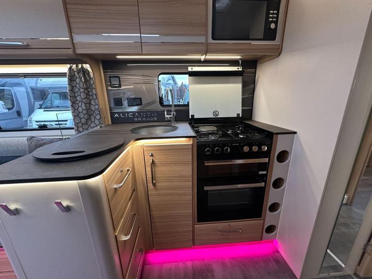 Fixed Island Bed, Pull-out Bed - Lounge conversion | Bathroom with separate shower and Thetford toilet | Alde Heating |Thetford Oven, Dometic Fridge/Freezer | Skylights| Tracker system | Solar Panel | Microwave | Alloy Wheels | LED Touchscreen Control Panel | Avtex Mobile Internet/WIFI.