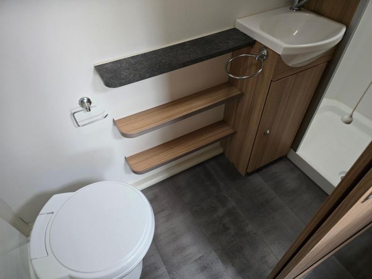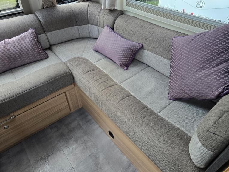 It also has a 3 way fridge with separate freezer, full oven hob and grill, stereo radio, blinds and nets on all the windows, heki rooflight, Truma iNet heating system, roof mounted digital aerial with booster box, 12v and 240v electrics, Nice upholstery, lots of storage space, end washroom with separate shower, sink with vanity unit and swivel cassette toilet.