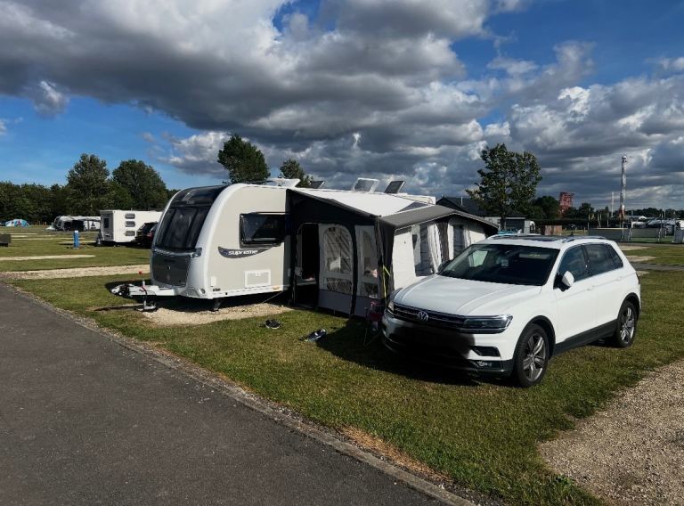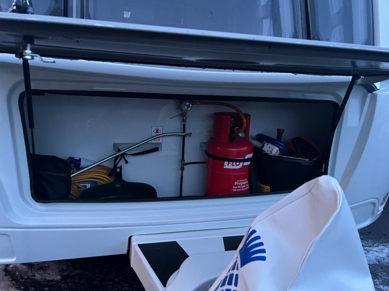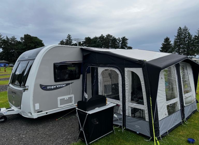 Awning included which is a Dometic Pro 330 Air Awning with floor mat, awning light and hold all storage cabinet.