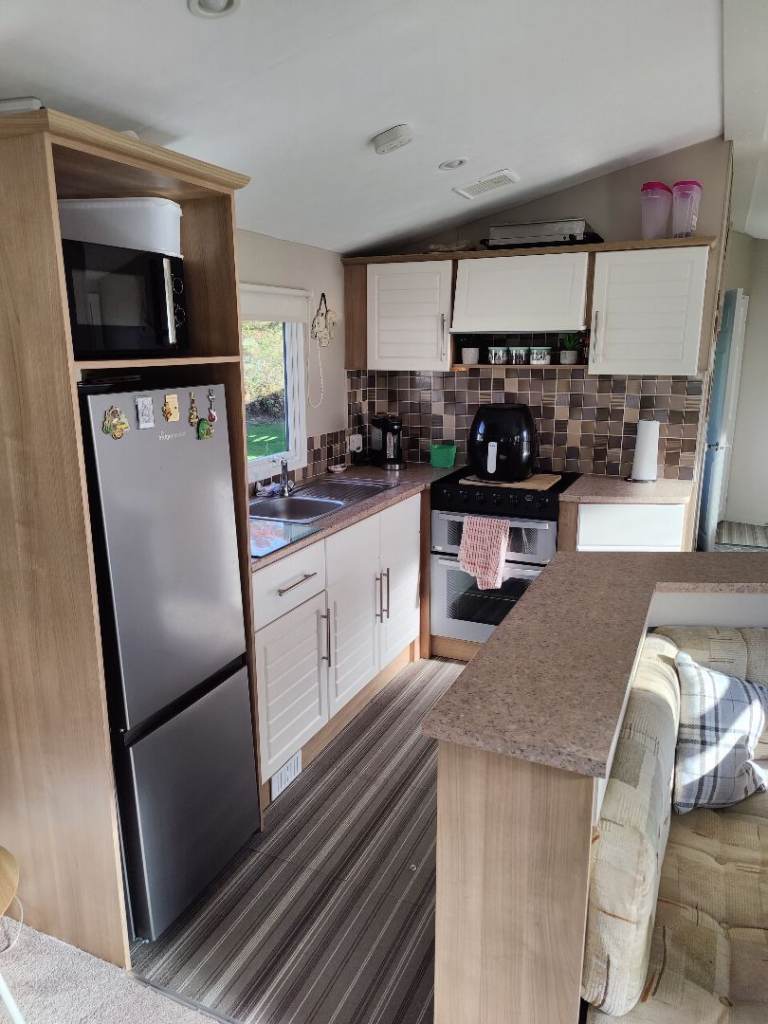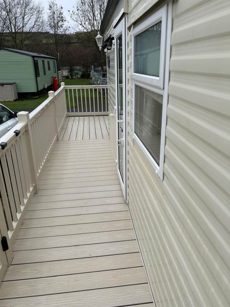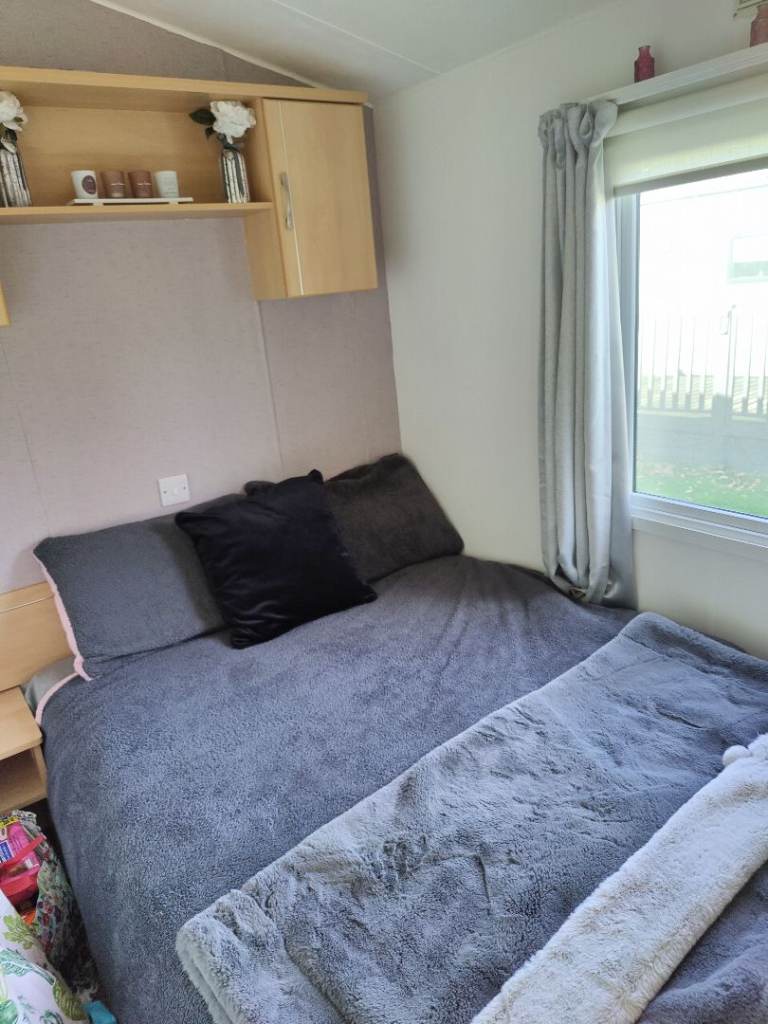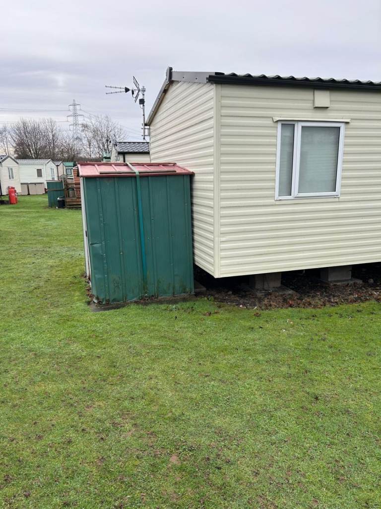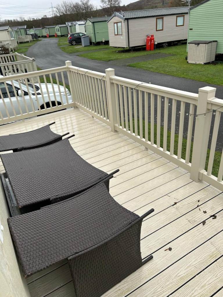 Comes complete with wrap around plastic decking with a gate,outside metal storage shed. Central heating, Double glazing, gas Oven, Gas fire, Fridge freezer ,microwave all included.The caravan is all set up ready to go we will leave what ever you want ie pots pans plates bedding ect. Two double beds and two single beds.Shower cubicle.