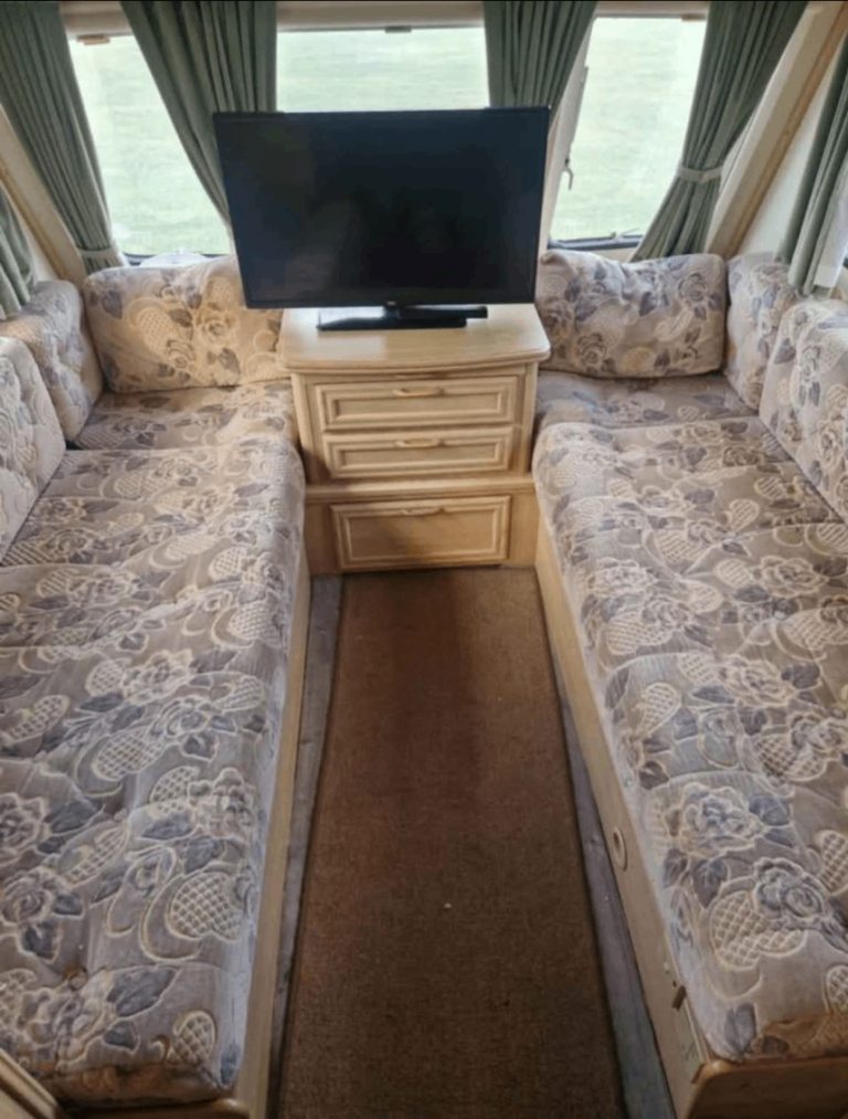 Caravan consists of large seating area at the front that turns in to a large double bed.