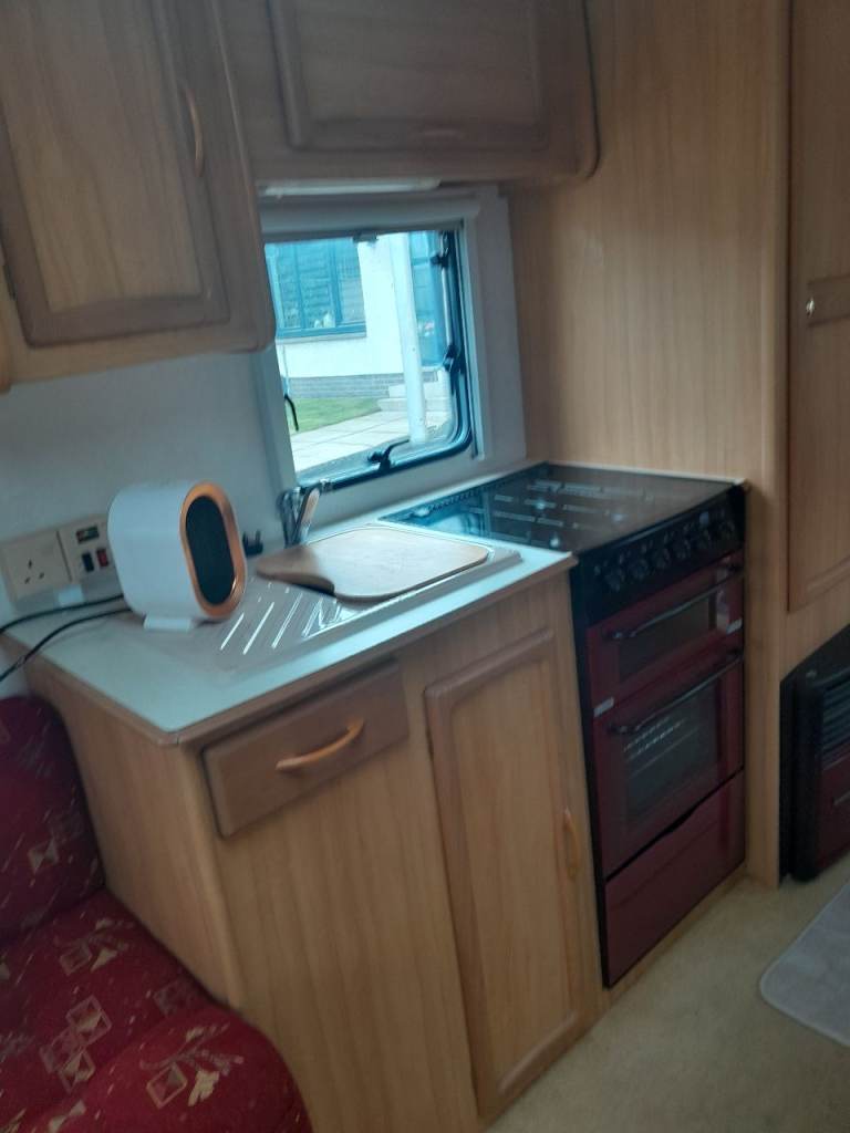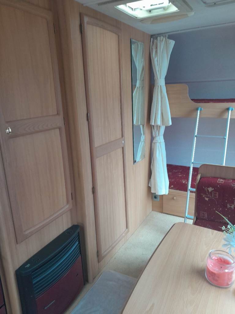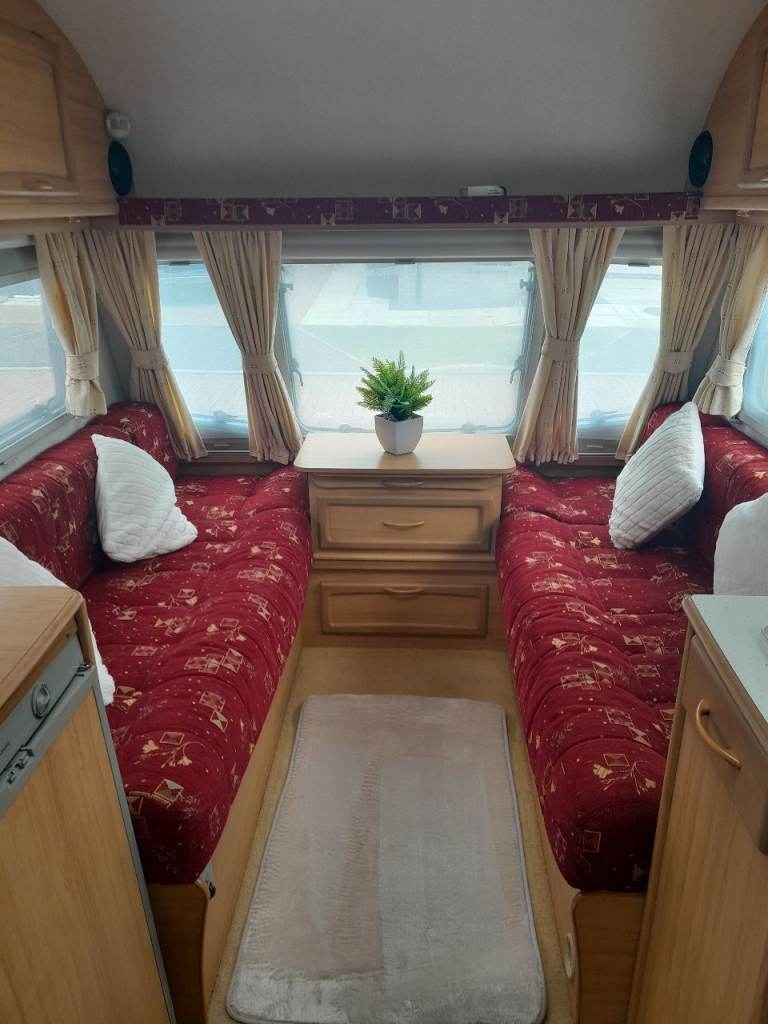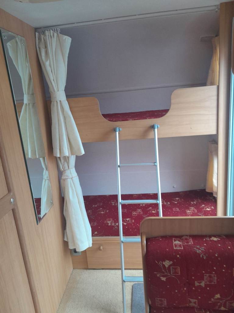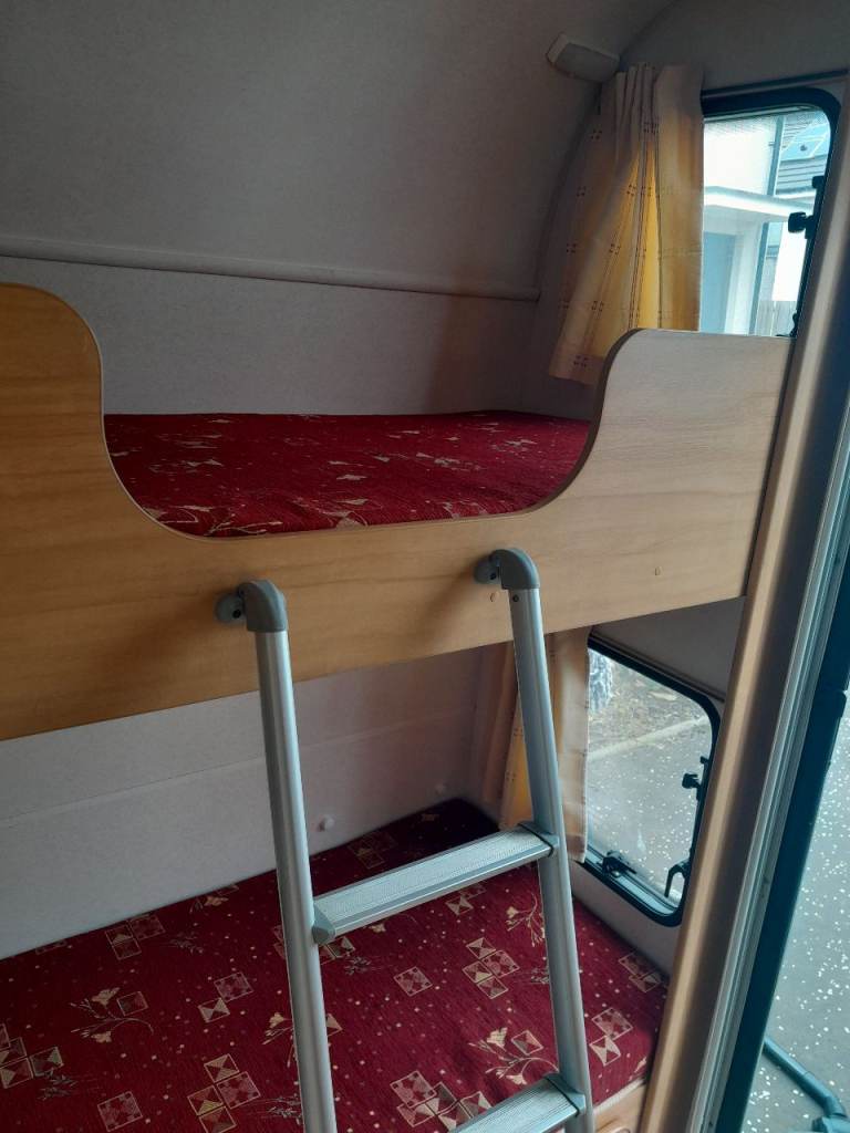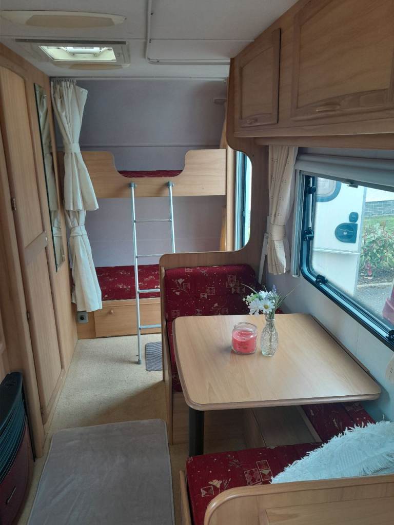 6 berth 2006, cassette toilet. Hot and cold shower. Full cooker seperate oven and grill, 4 burner hob, 12/240 voltage, side dinette area. Bunk beds at side and at rear with ladder. Full awning. Water container and electric hook up cable. No damp, carver hearing, lots of storage. Large skylight. Recent service, cushions and carpet been shampoo , curtains freshly washed, ready for holidays, beautiful condition throughout. Any inspection welcome, can deliver gor a fee. Rare 6 berth. Priced to sell