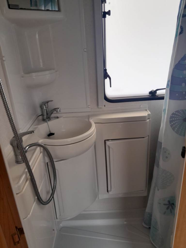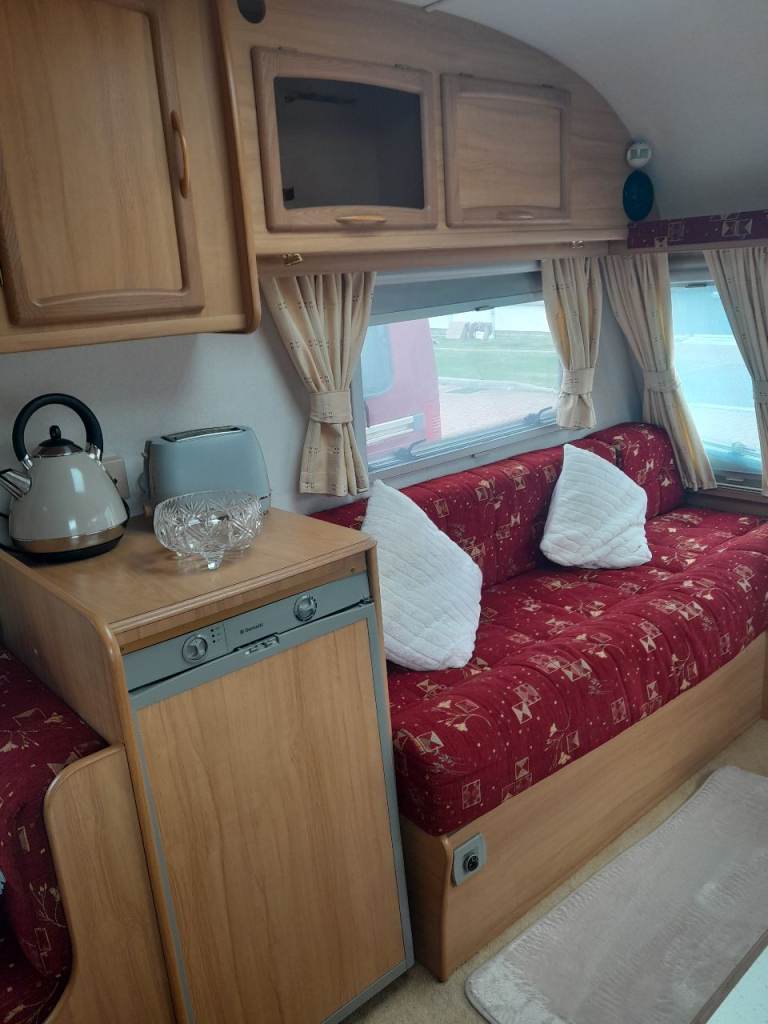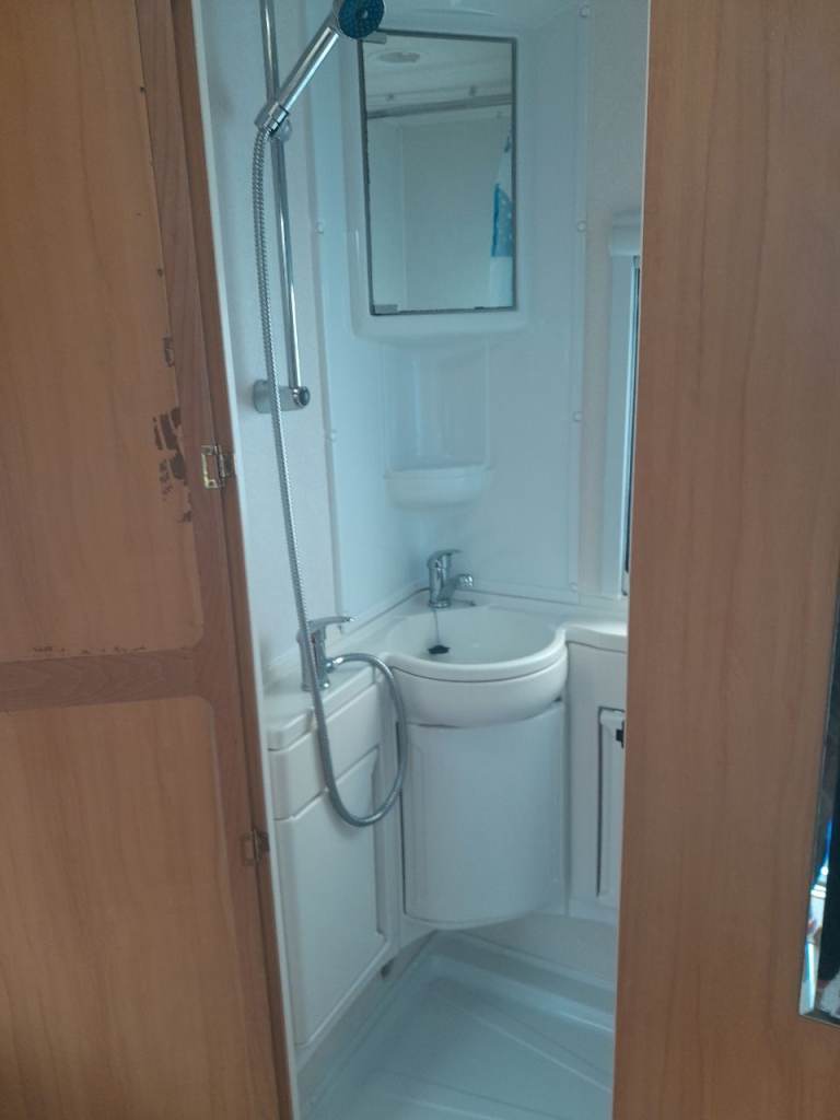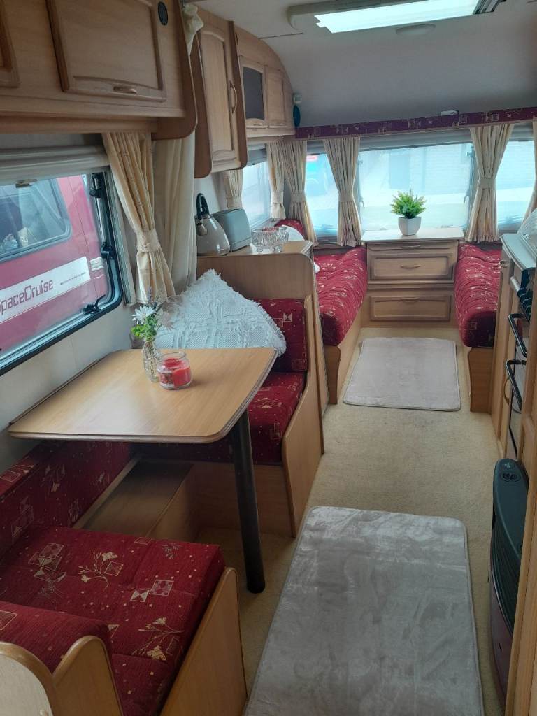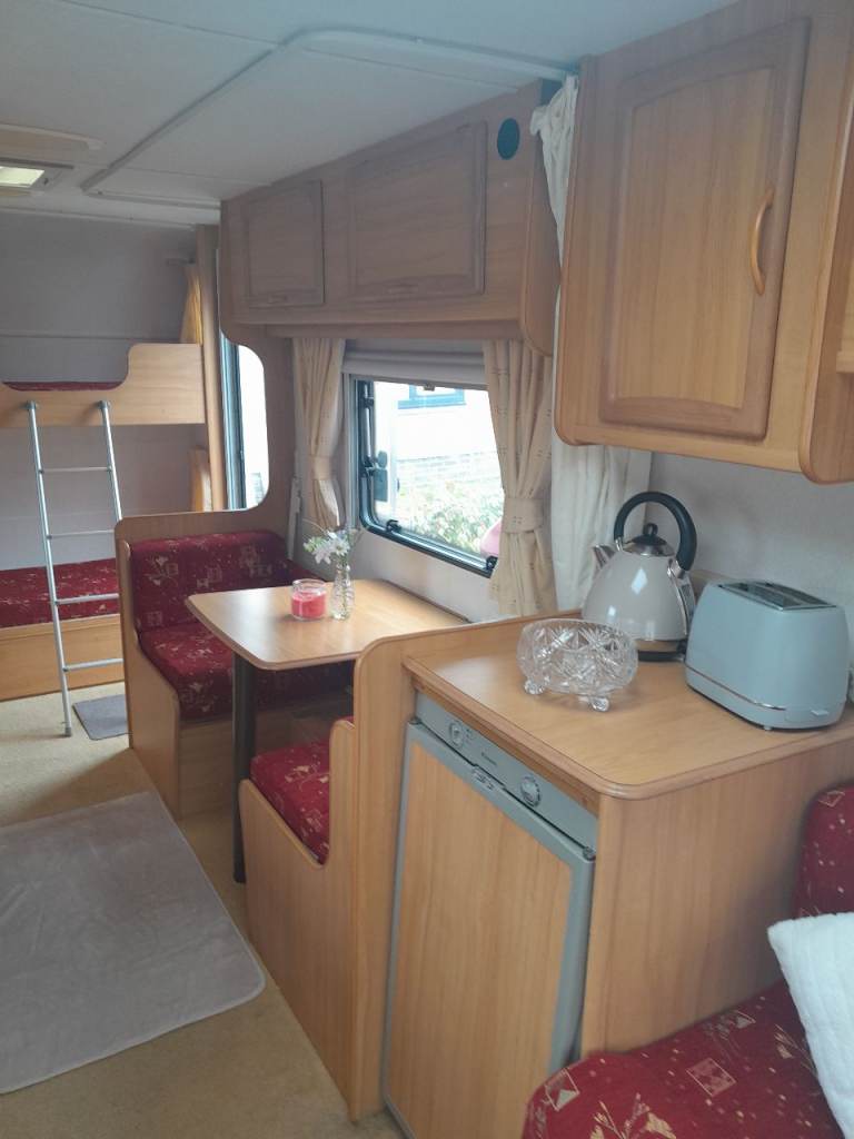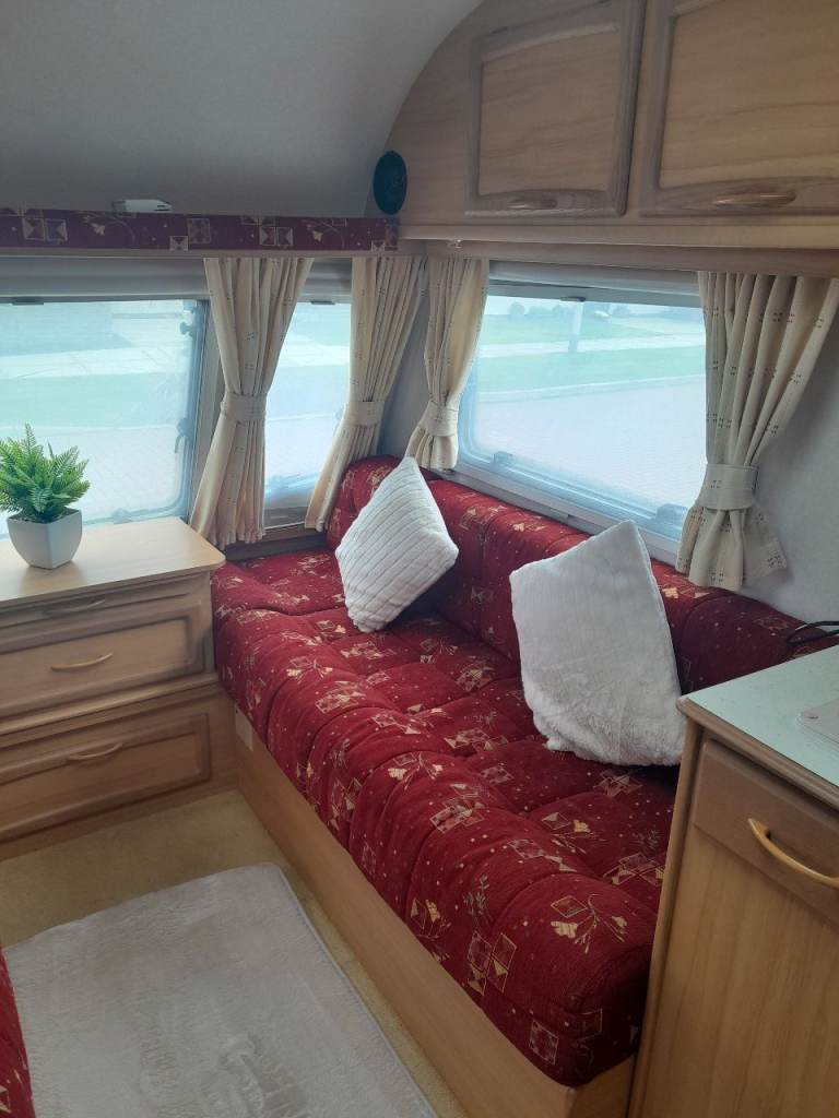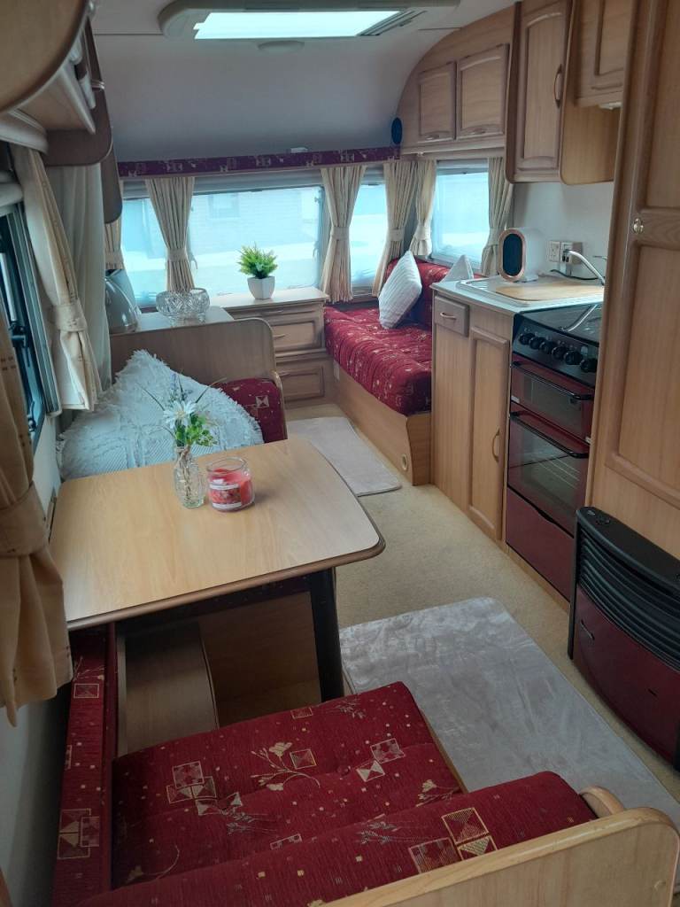 6 berth 2006, cassette toilet. Hot and cold shower. Full cooker seperate oven and grill, 4 burner hob, 12/240 voltage, side dinette area. Bunk beds at side and at rear with ladder. Full awning. Water container and electric hook up cable. No damp, carver hearing, lots of storage. Large skylight. Recent service, cushions and carpet been shampoo , curtains freshly washed, ready for holidays, beautiful condition throughout. Any inspection welcome, can deliver gor a fee. Rare 6 berth. Priced to sell