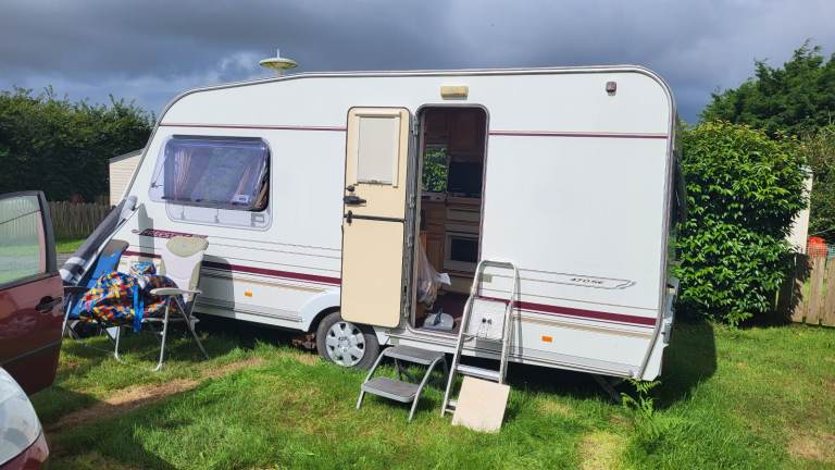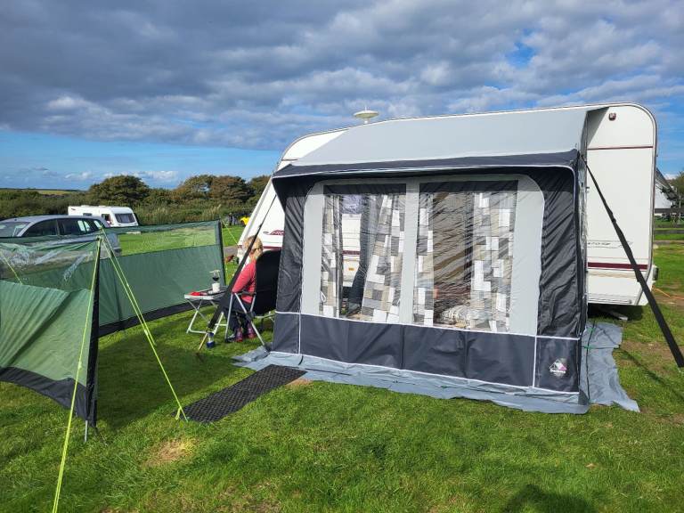 There is a really good heavy duty porch awning (Dorema Quattro 275) but we are thinking of taking that with us (we have bought another Abbey - just upsizing - Spectrum 535, 2007 and she will also be kept at Rob and Becca's ). But we might be open to a good offer, it's virtually new and cost us £800. Metal poles, not blow up. Very sturdy.