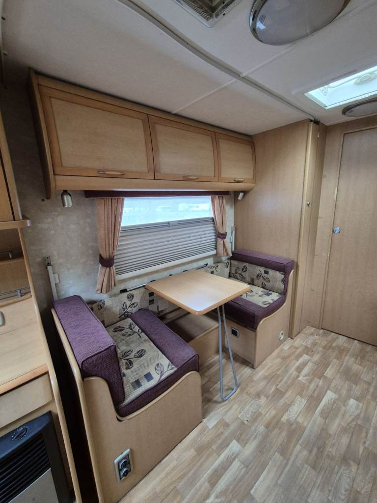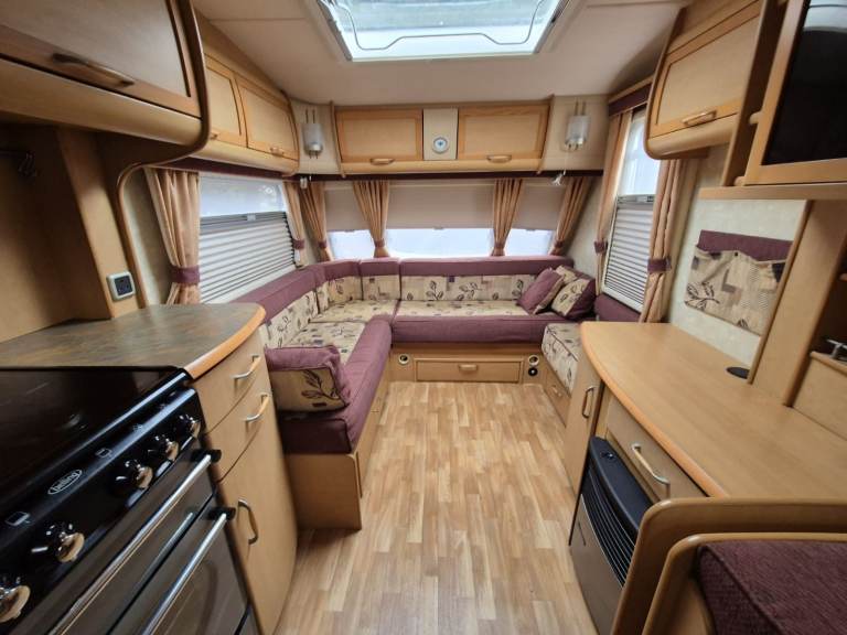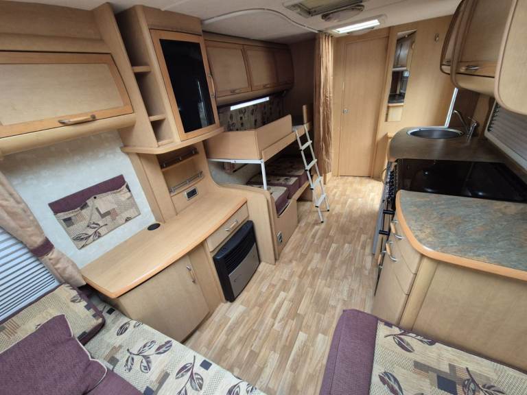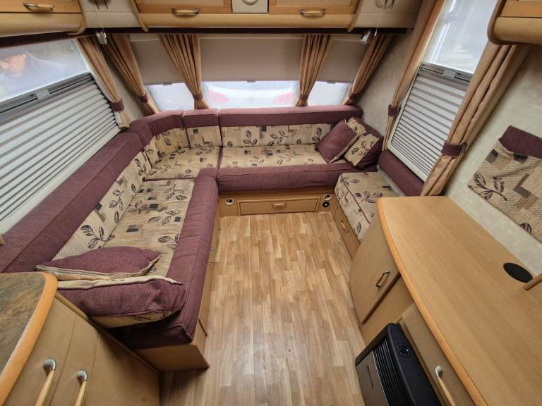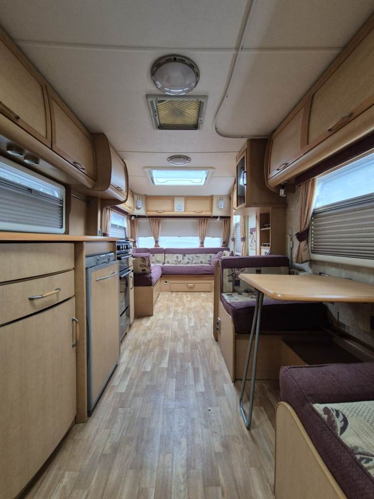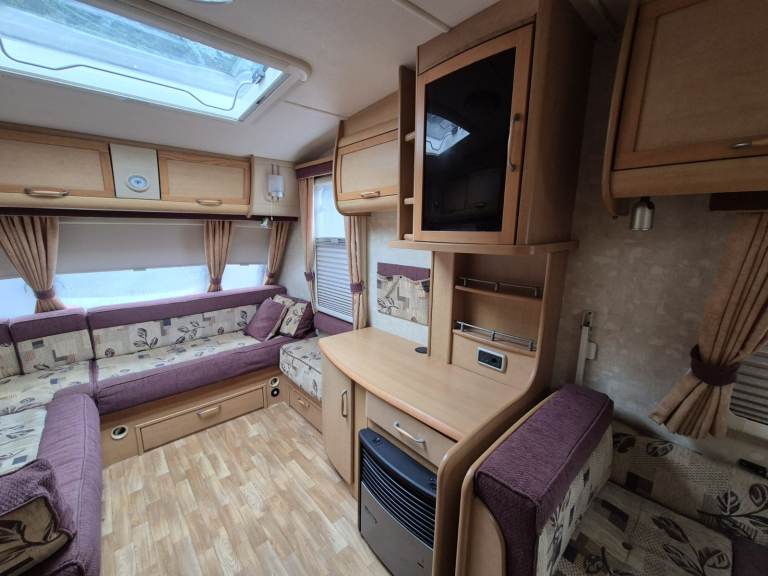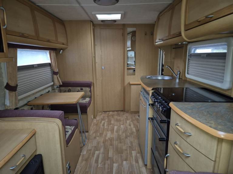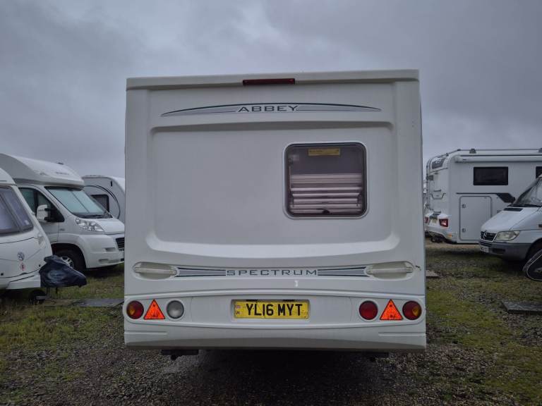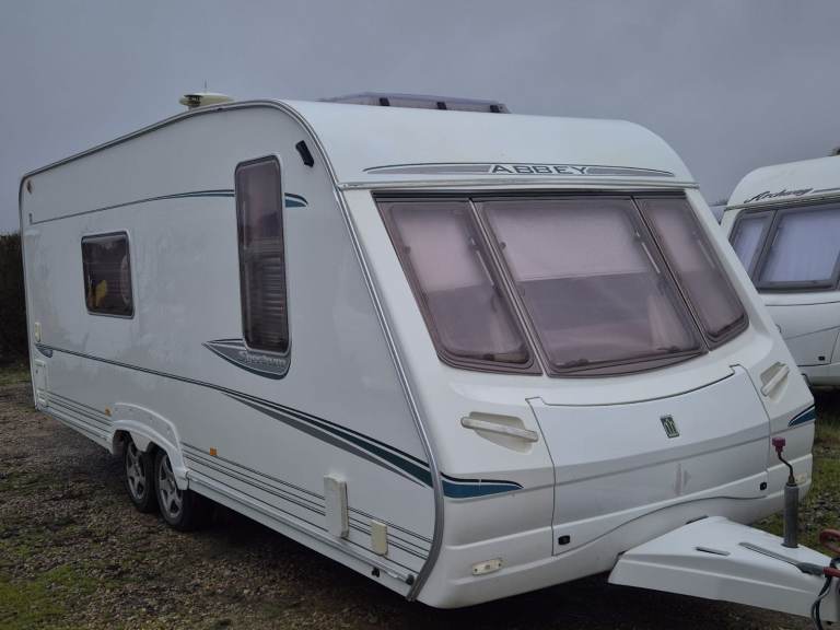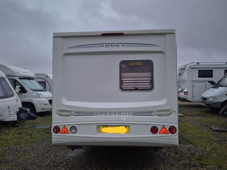 For sale ABBEY SPECTRUM 2004 FOUR BERTH twin axle caravan - just one previous owner . It's well kept and clean , without any damp . Inside it is in very good condition . Furniture , curtains , SOLID floor - everything is in outstanding condition . Outside of the caravan is in a very good condition . The equipment that we can find in this caravan are L- shape sofa in the front of the caravan which after being made turn into a double bed . Opposite the kitchen is seats with table and can be converted to bunk beds . It has water heater , heater , blinds and flyscreens , wardrobe , a lot of shelves . In the caravan there is a kitchen , equipped with 3 gas and 1 electric hobs , an oven , grill , fridge with freezer . Of course , there is also a bathroom with a hand wash basin , a separate shower , toilet and a cupboard . You have everything that you need in this caravan for a holiday which is : caravan TRACKER , DOREMA awning with curtains , motor mover , a stabiliser - alko aks ( due to it the caravan towing is very easy ) , towing mirrors , satellite aerial , mains cable , a gas bottle , battery , a step , built-in water tank , water barrel , wastemaster , CRIS certificate , all manual instruction , set of keys , a lot of small things needed at the campsite , winter cover . The caravan can be used straight away for holidays