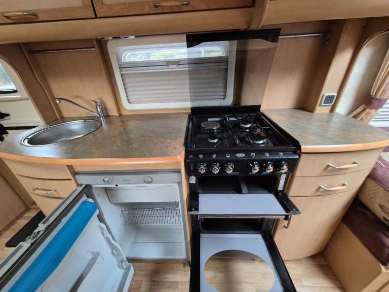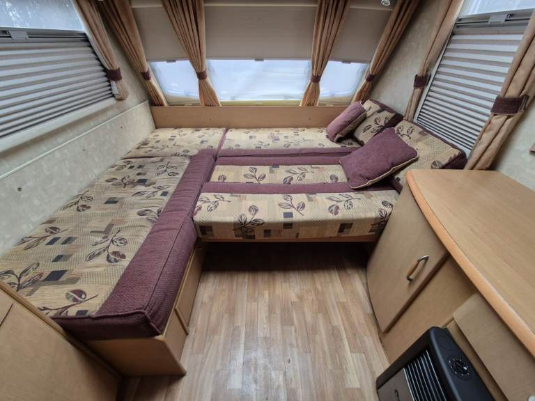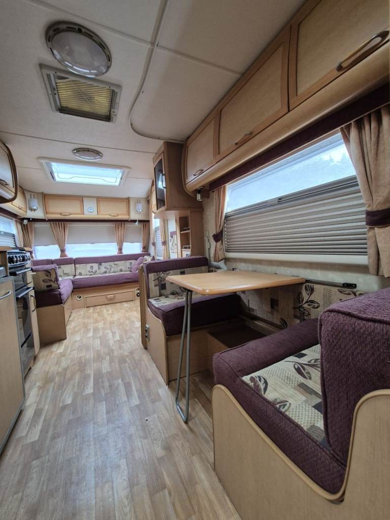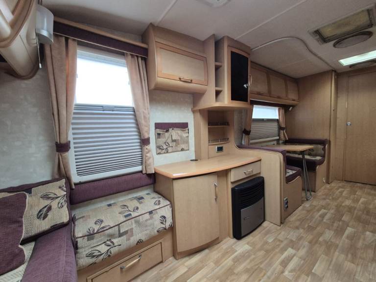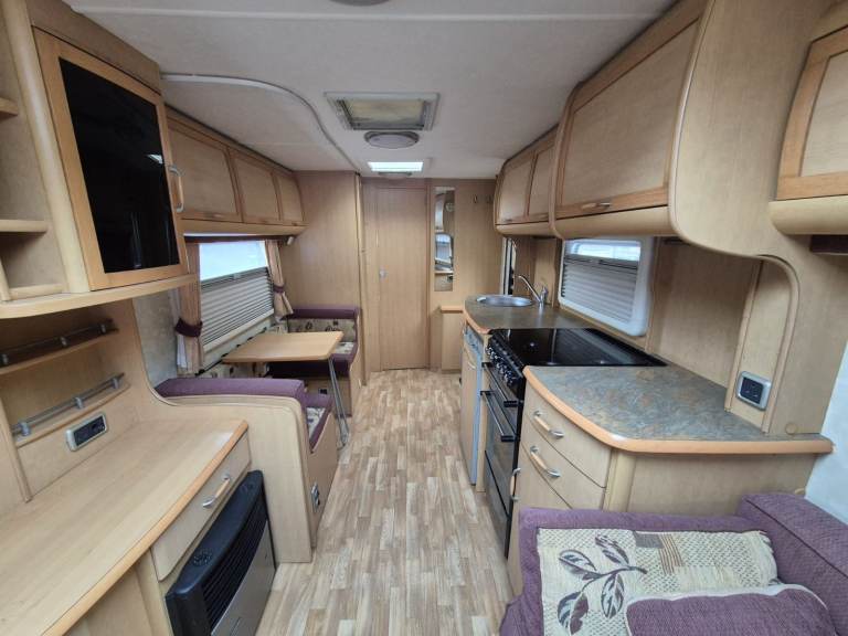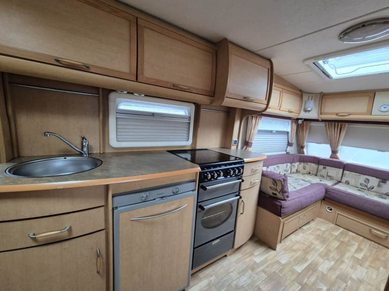 For sale ABBEY SPECTRUM 2004 FOUR BERTH twin axle caravan - just one previous owner . It's well kept and clean , without any damp . Inside it is in very good condition . Furniture , curtains , SOLID floor - everything is in outstanding condition . Outside of the caravan is in a very good condition . The equipment that we can find in this caravan are L- shape sofa in the front of the caravan which after being made turn into a double bed . Opposite the kitchen is seats with table and can be converted to bunk beds . It has water heater , heater , blinds and flyscreens , wardrobe , a lot of shelves . In the caravan there is a kitchen , equipped with 3 gas and 1 electric hobs , an oven , grill , fridge with freezer . Of course , there is also a bathroom with a hand wash basin , a separate shower , toilet and a cupboard . You have everything that you need in this caravan for a holiday which is : caravan TRACKER , DOREMA awning with curtains , motor mover , a stabiliser - alko aks ( due to it the caravan towing is very easy ) , towing mirrors , satellite aerial , mains cable , a gas bottle , battery , a step , built-in water tank , water barrel , wastemaster , CRIS certificate , all manual instruction , set of keys , a lot of small things needed at the campsite , winter cover . The caravan can be used straight away for holidays