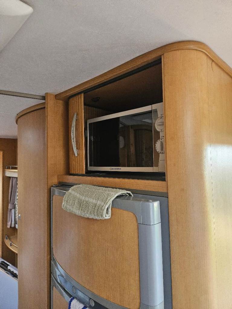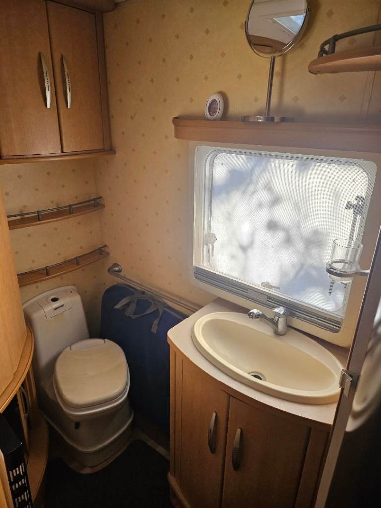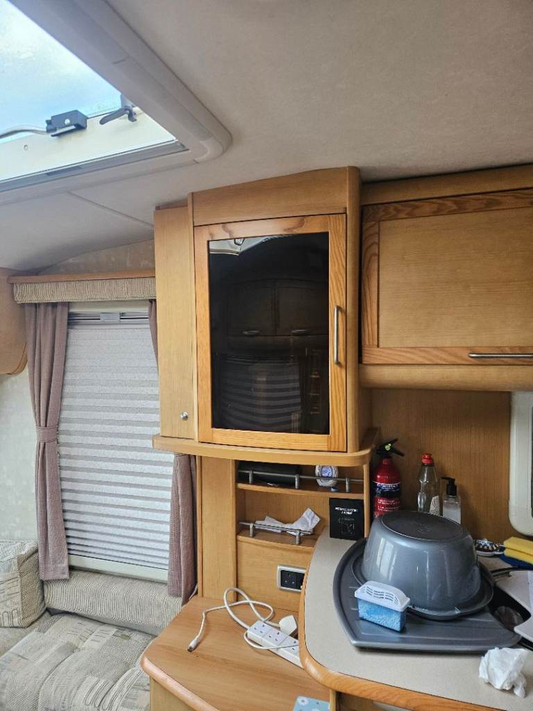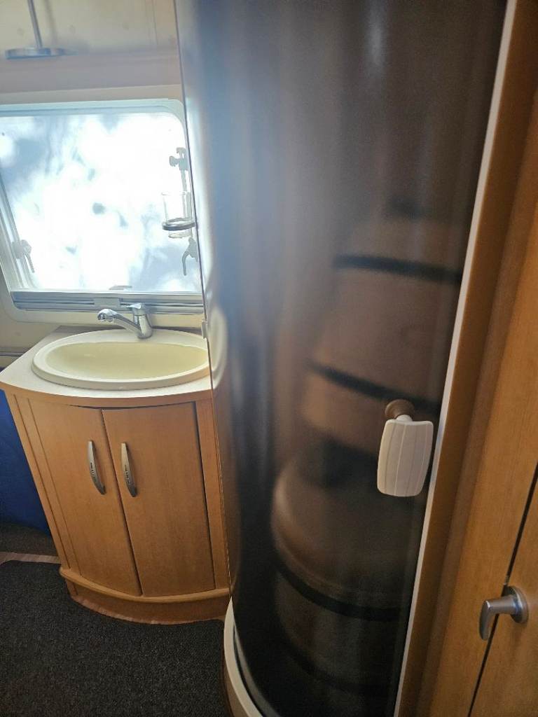 Abbey Spectrum 540 for sale. 4 berth fixed bed with L shape lounge that pulls out into a king-size bed. Rear shower room that consists of Thetford cassette toilet with basin and storage cupboard and full size shower cubicle. Also in there is a large storage cupboard. The fixed bed has a new memory foam mattress that's less than 10 mths old. Large storage area beneath the bed that's ideal for stowing the Awning. Large wardrobe in bedroom area which houses power control box.