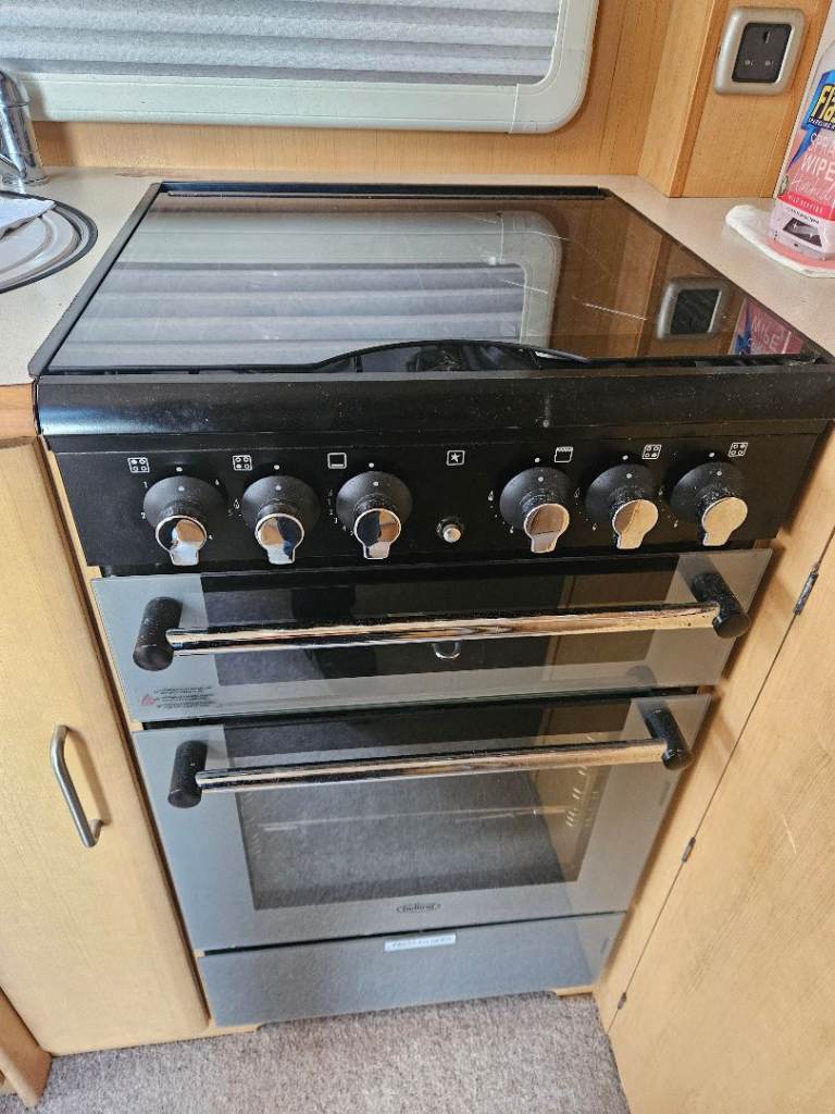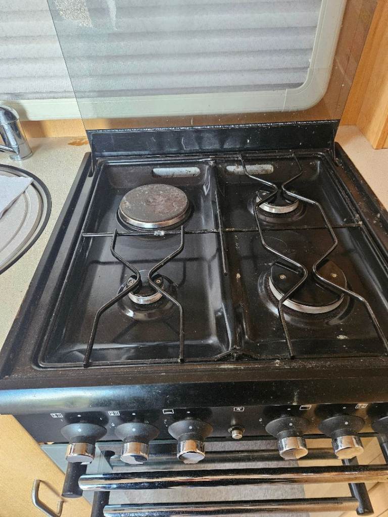 Kitchen consists of cooker with 3 ring hob and hot plate, oven and saucepan storage. Stainless steel sink with lever tap and large storage cupboard below and cutlery drawer. Above is a drinks cabinet with glass door. Above the sink is 2 storage cupboards we use for food. 4 storage cupboards above the l shape seating area and deep storage under the side seating sofa.