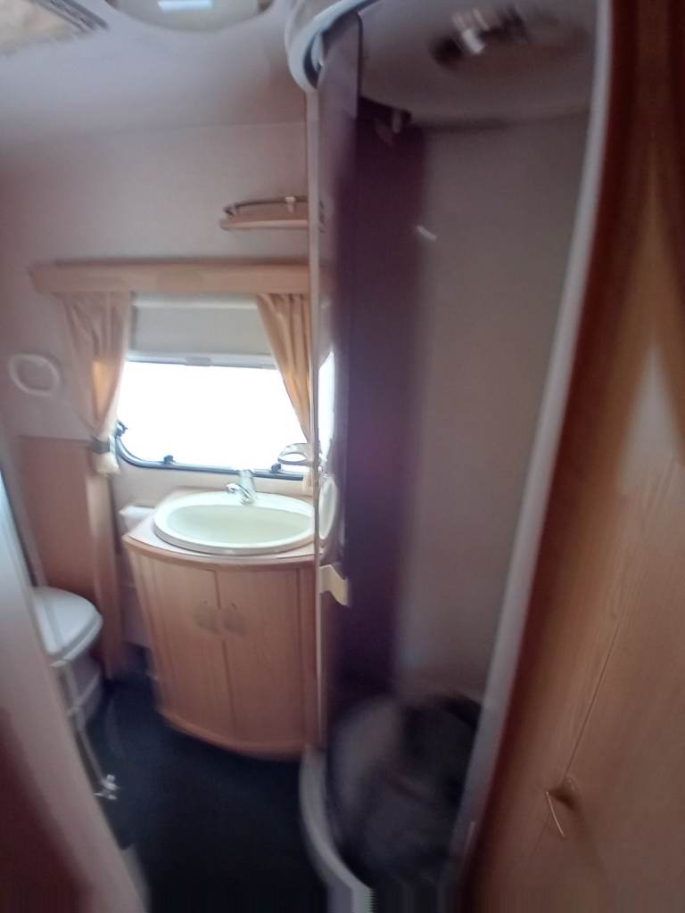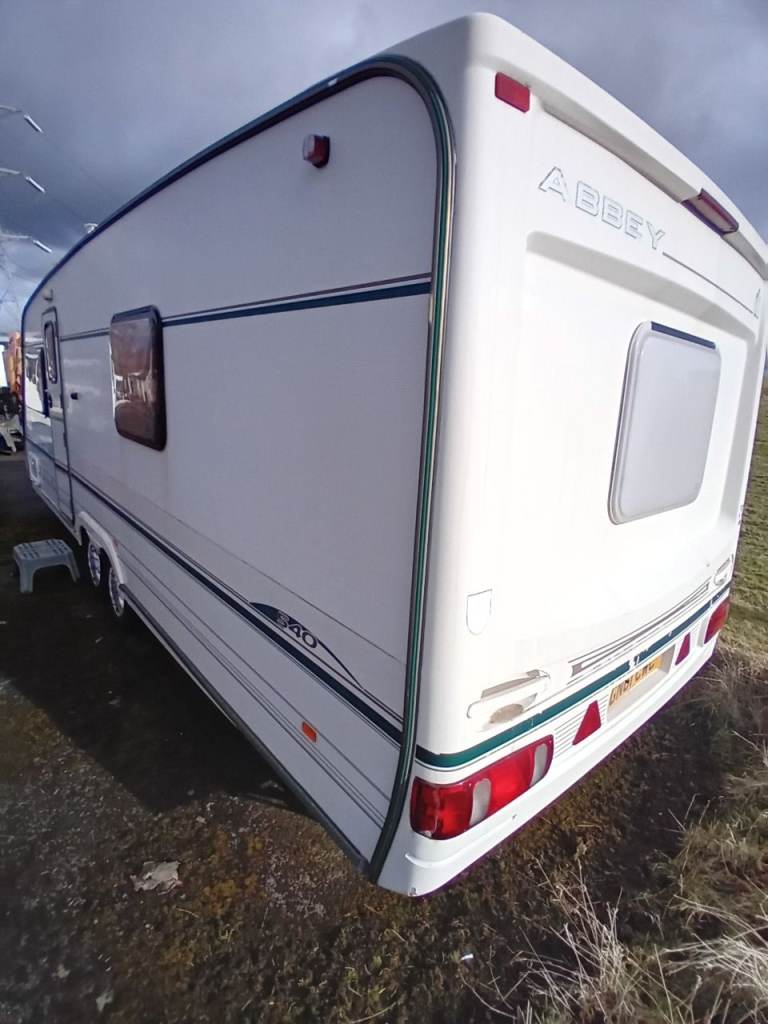 Abbey spectrum 4 berth fix bed touring caravan has end washroom with separate toilet and shower compartment 3 way fridge freezer full size cooker blinds curtains and fly nets fix double bed .