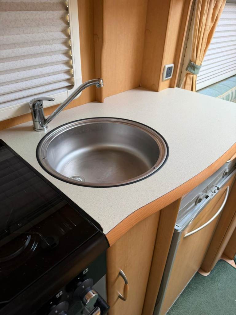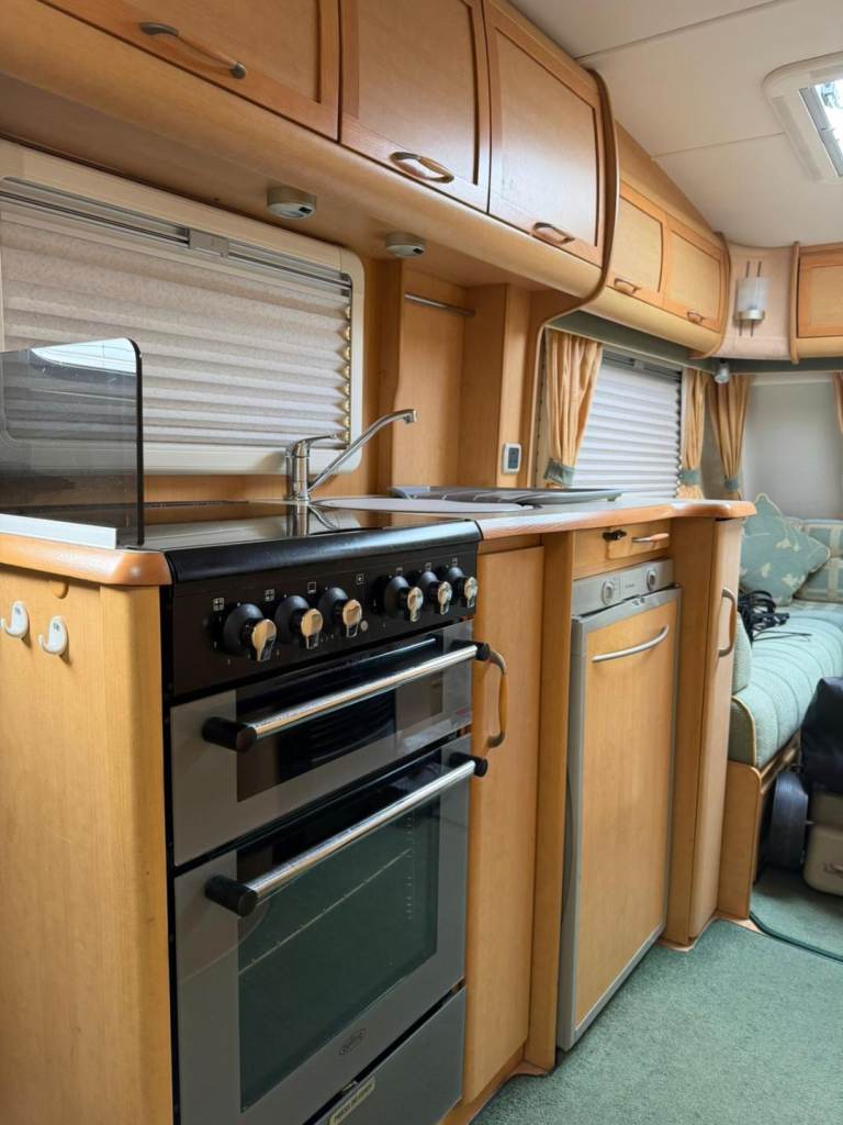 The kitchen area is fully equipped with a cooker, hob, sink, fridge, and plenty of cupboard storage, making it easy to prepare meals while away. Toward the rear, the caravan features a well-designed bedroom space that make a double bed with bunk beds over the top if needed can be closed off for privacy, central toilet, wash basin, and shower facilities.