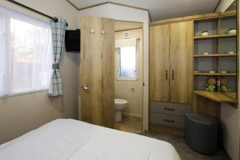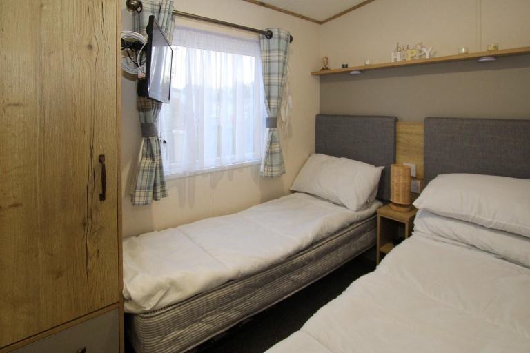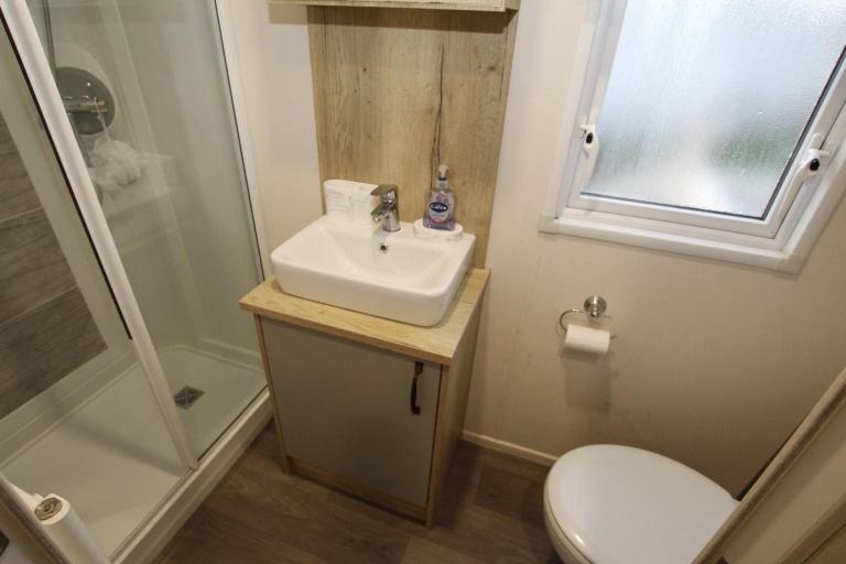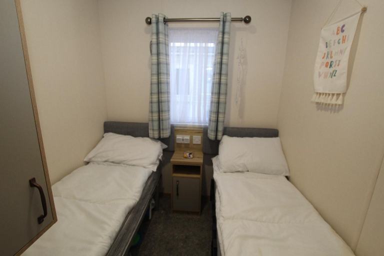 There are 3 spacious bedrooms (one double and two with twin singles). The master bedroom is a great size and comes with a flip-up storage bed, a built-in double wardrobe, bedside cabinets, a dressing table, and an en-suite toilet. It’s a spacious room with plenty of floor-space around the bed. The twin rooms each come with two single beds and their own wardrobe. There’s also a family wash-room with a double shower, toilet and sink.
