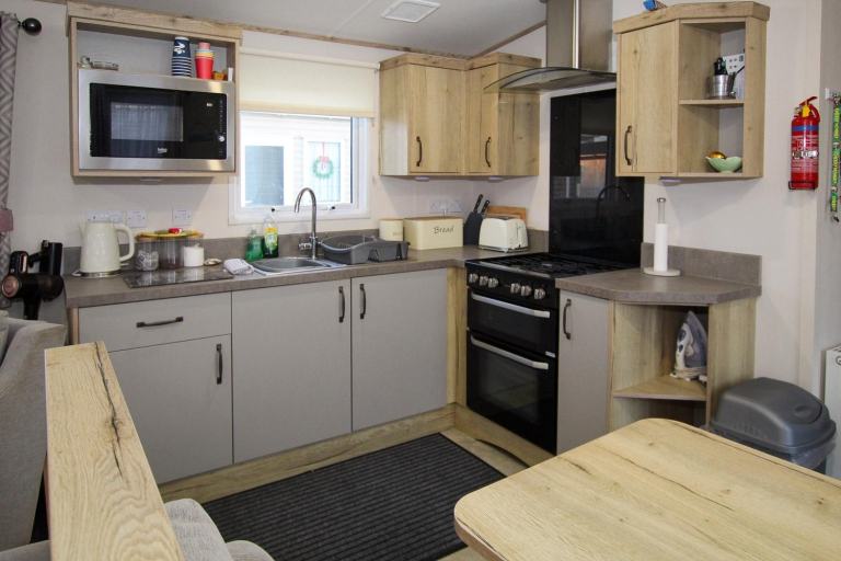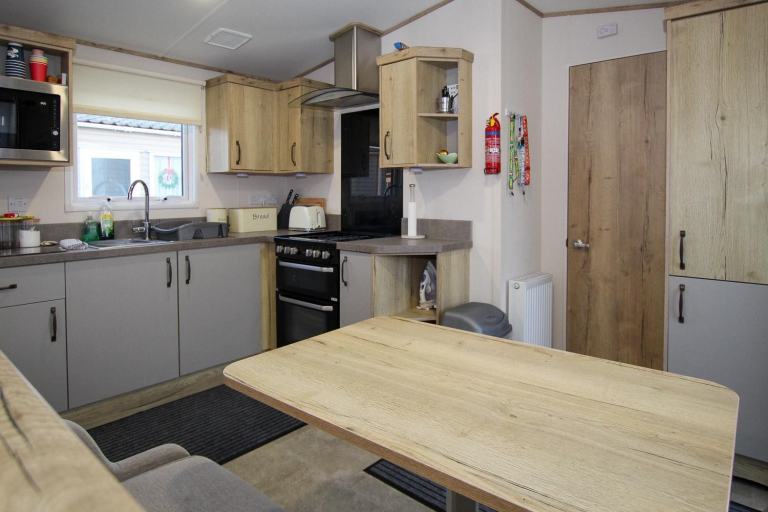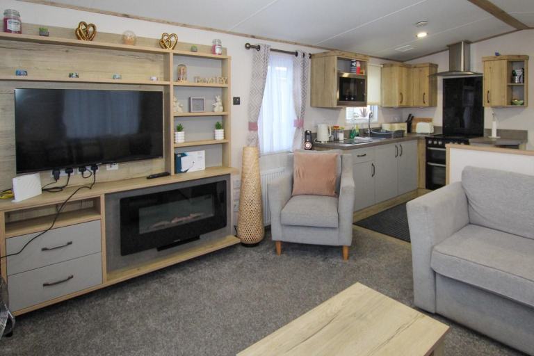 The main living area is open plan and feels very spacious with a comfortable corner sofa (with a pull-out sofa-bed) and a matching armchair, front-opening patio doors, a coffee table, an electric fire with a TV shelf above, and built-in Bluetooth speakers in the ceiling. There’s a large kitchen area with a gas-cooker and hob (with an extractor), a full-size integrated fridge & freezer, a separate dining area, and lots of cupboards and work-space.